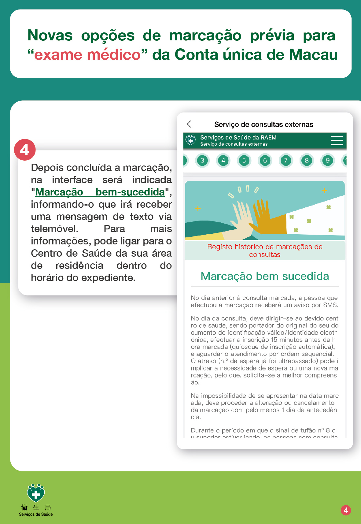 Para efectuar a marcação online do exame médico (através de qualquer uma das formas acima referidas), deve seguir os seguintes passos: clique sucessivamente "A minha saúde" > "Serviços de Consulta Externa" > "Marcação de Consultas Externas dos Centros de Saúde" > "exame médico", e, por último, escolha o tipo de exame médico pretendido. Depois concluída a marcação com sucesso, irá receber uma mensagem de texto via telemóvel. O serviço de exame médico deve ser marcado com 14 dias de antecedência. Pode consultar o registo de marcação de consulta externa dos Centros de Saúde em "Serviços de Consulta Externa" acima referido, bem como pode proceder à alteração da data de marcação ou cancelamento da marcação, entre outros serviços.
