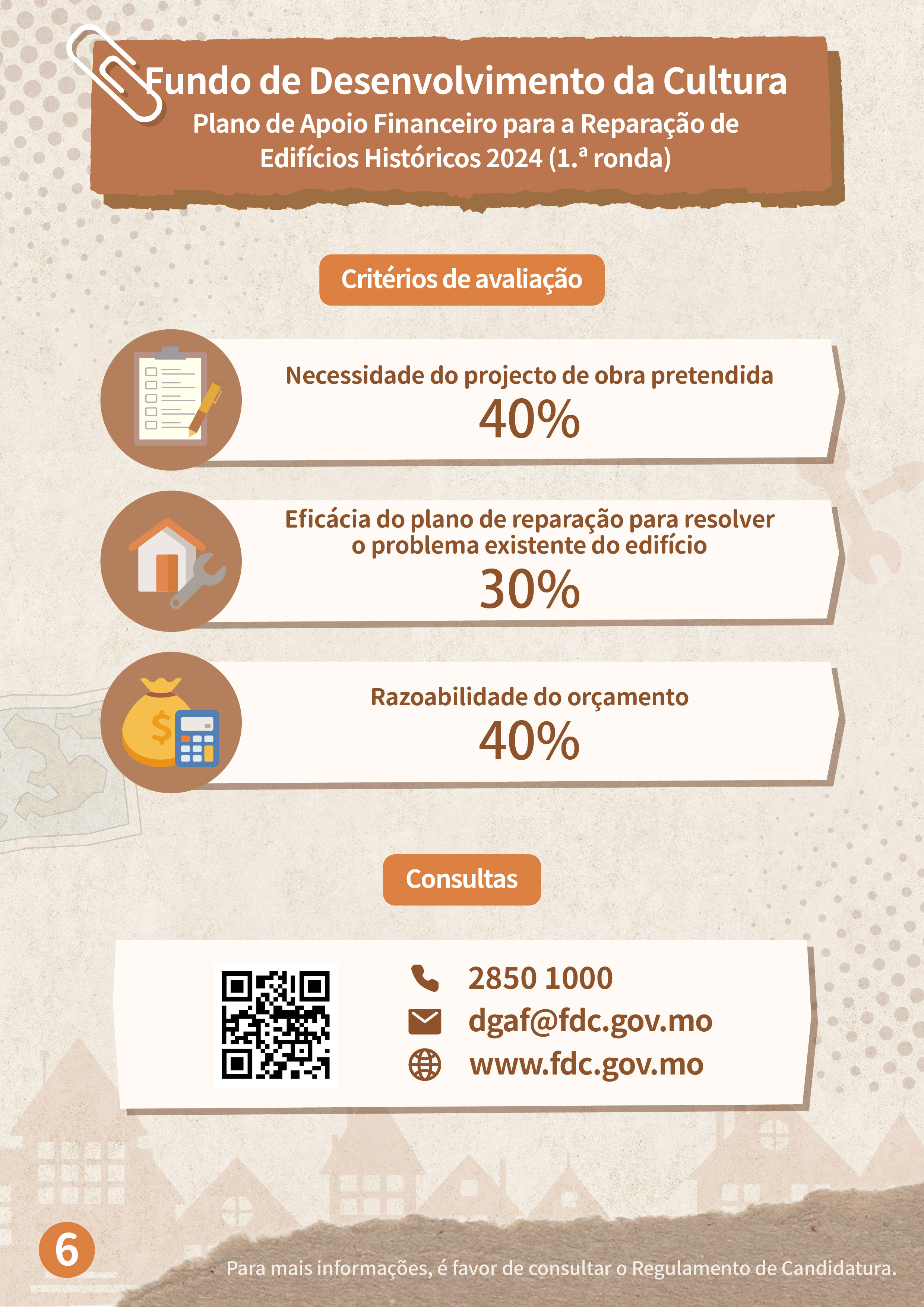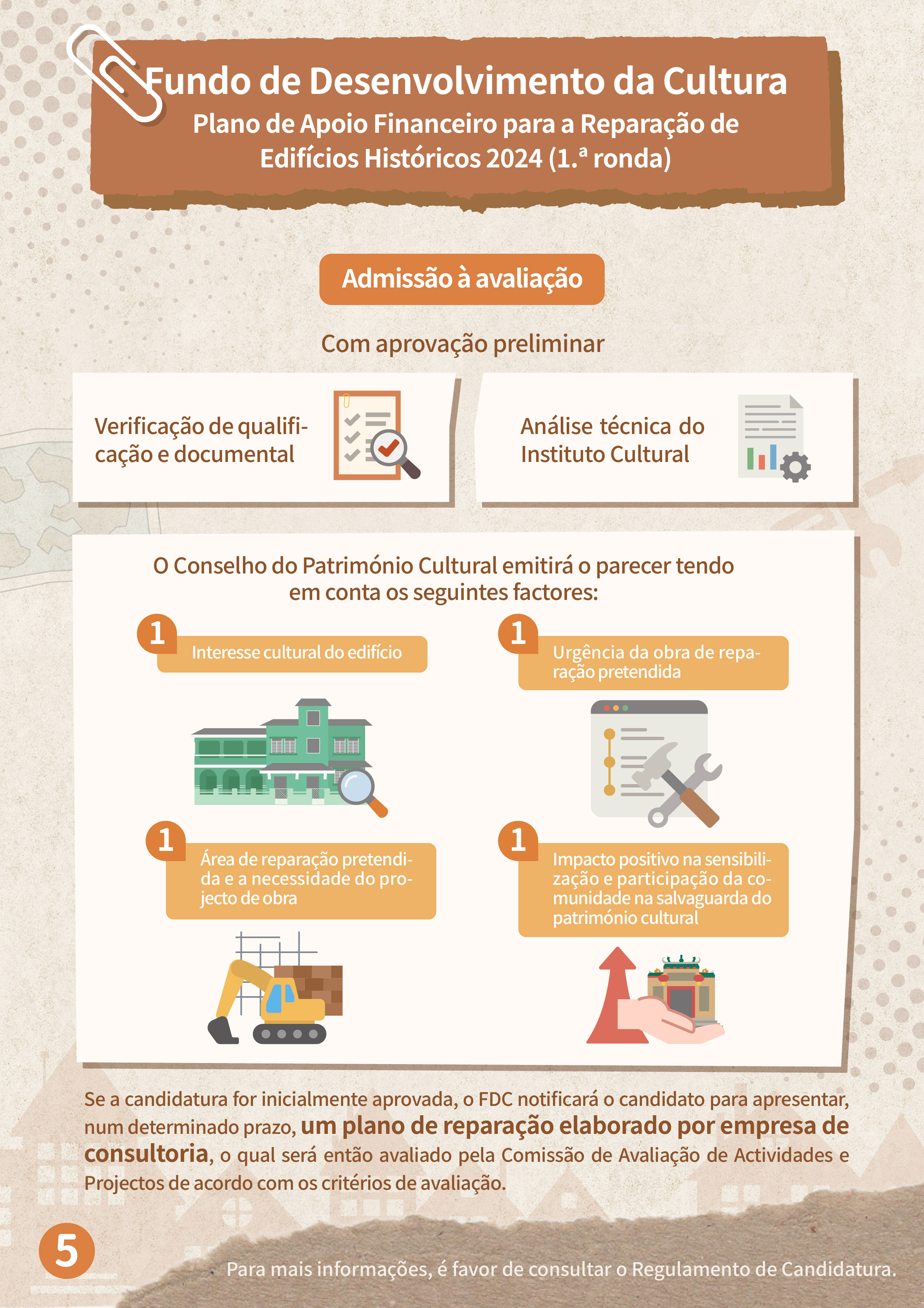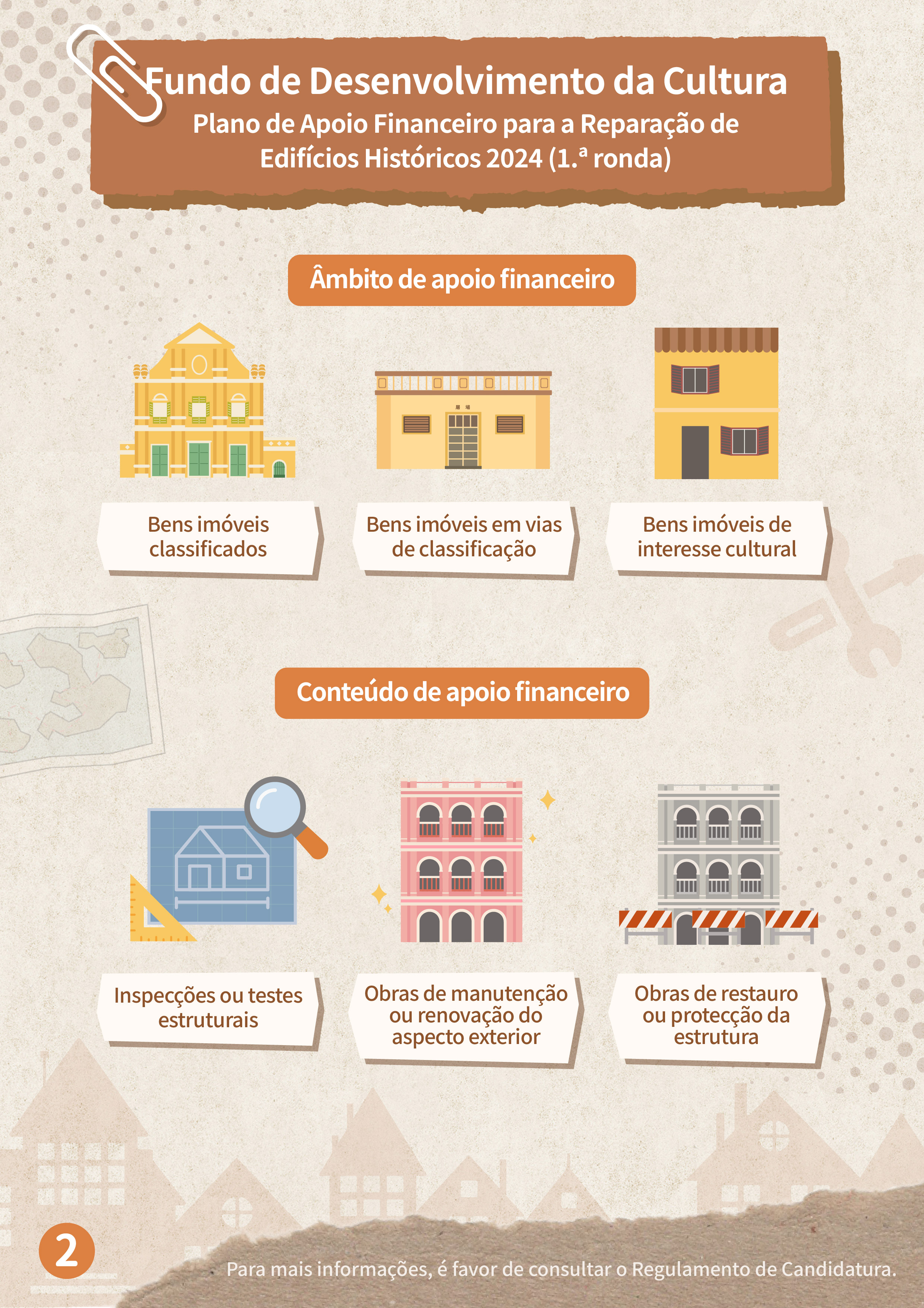 Para melhor promover a salvaguarda e a revitalização dos edifícios históricos, o Fundo de Desenvolvimento da Cultura (FDC) continuar a lançar, no corrente ano, o “Plano de apoio financeiro para a reparação de edifícios históricos”, de modo a aumentar a motivação dos proprietários de realizarem a reparação regular por iniciativa própria e reforçar a salvaguarda dos edifícios patrimoniais privados e de interesse cultural.