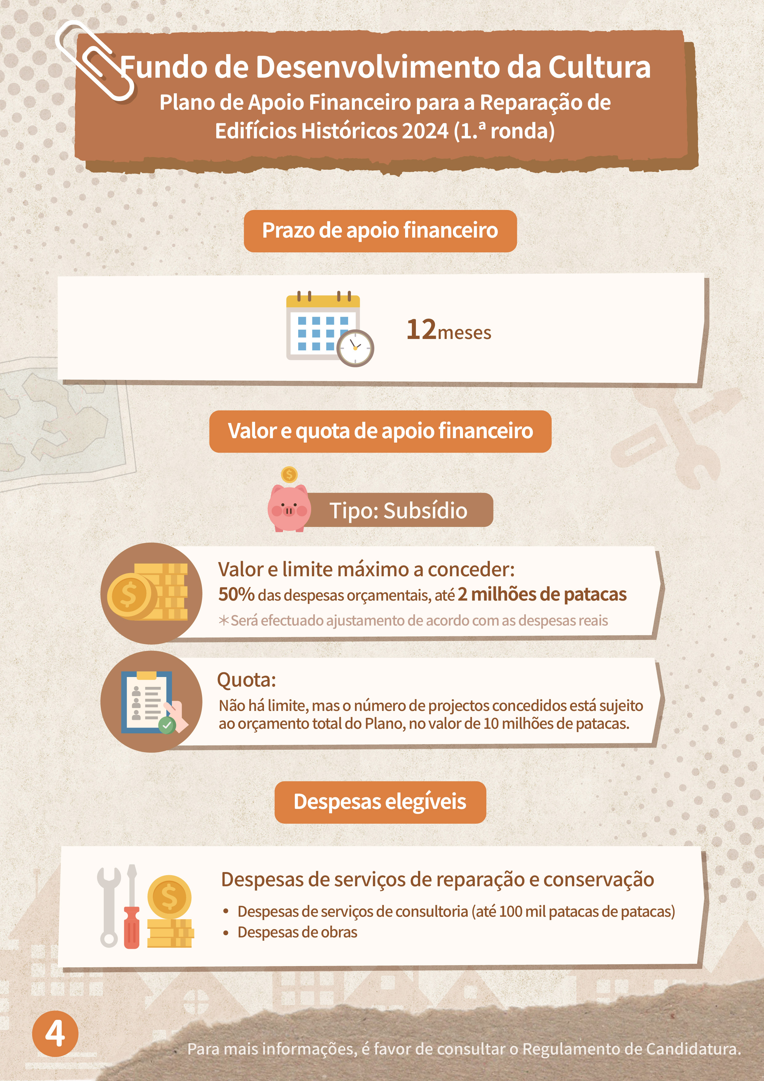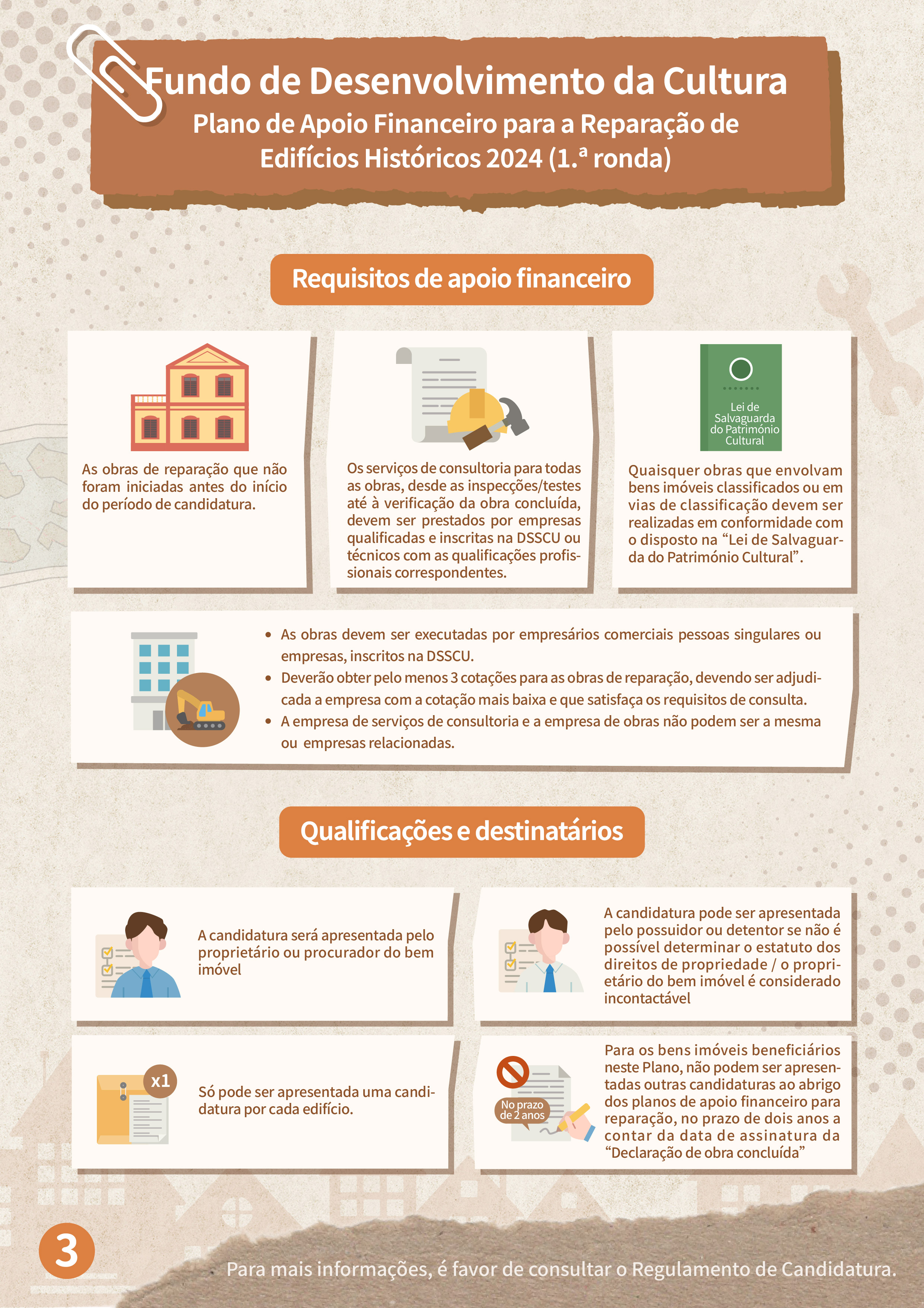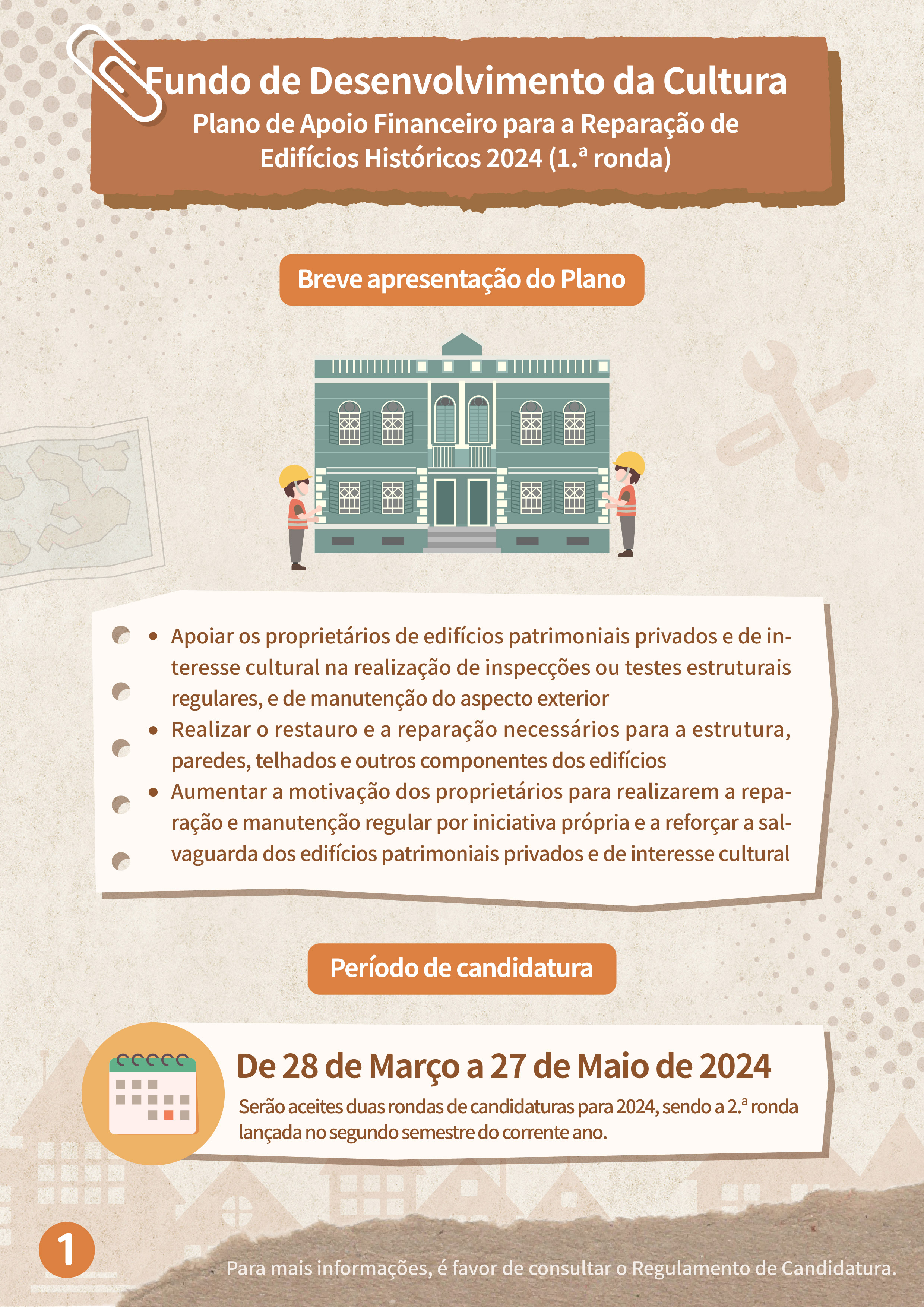 No total, serão aceites duas rondas de candidaturas para 2024, sendo o período de candidatura para a 1.ª ronda de 28 de Março a 27 de Maio de 2024. O âmbito de apoio financeiro abrange os bens imóveis classificados, em vias de classificação e de interesse cultural, cujas obras de reparação ainda não tenham sido iniciadas antes do período de candidatura, devendo a candidatura ser apresentada pelo proprietário ou procurador do bem imóvel. Caso não seja possível determinar o estatuto dos direitos de propriedade ou o proprietário do bem imóvel seja considerado incontactável, a candidatura pode ser apresentada pelo possuidor ou detentor.
