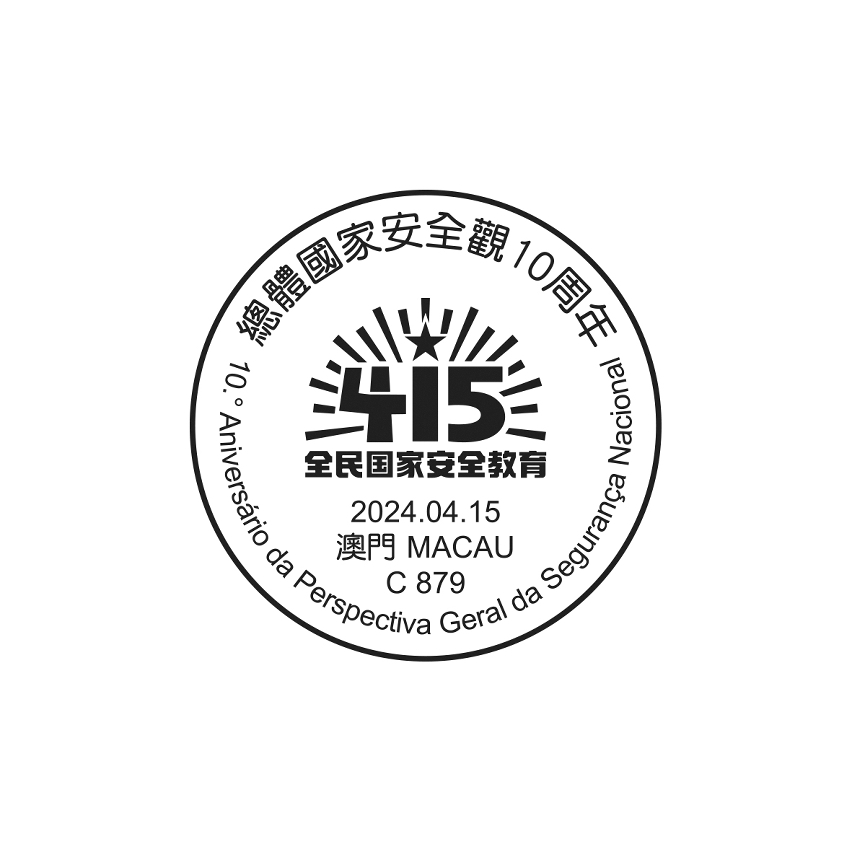 Para assinalar o 10.º Aniversário da Perspectiva Geral da Segurança Nacional, a Direcção dos Serviços de Correios e Telecomunicações informa que, no dia 15 de Abril de 2024, haverá um Posto de Correio Temporário, com o carimbo comemorativo “10.º Aniversário da Perspectiva Geral da Segurança Nacional”, instalado na Loja de Filatelia da Estação Central, das 9h00 às 17h30 horas.