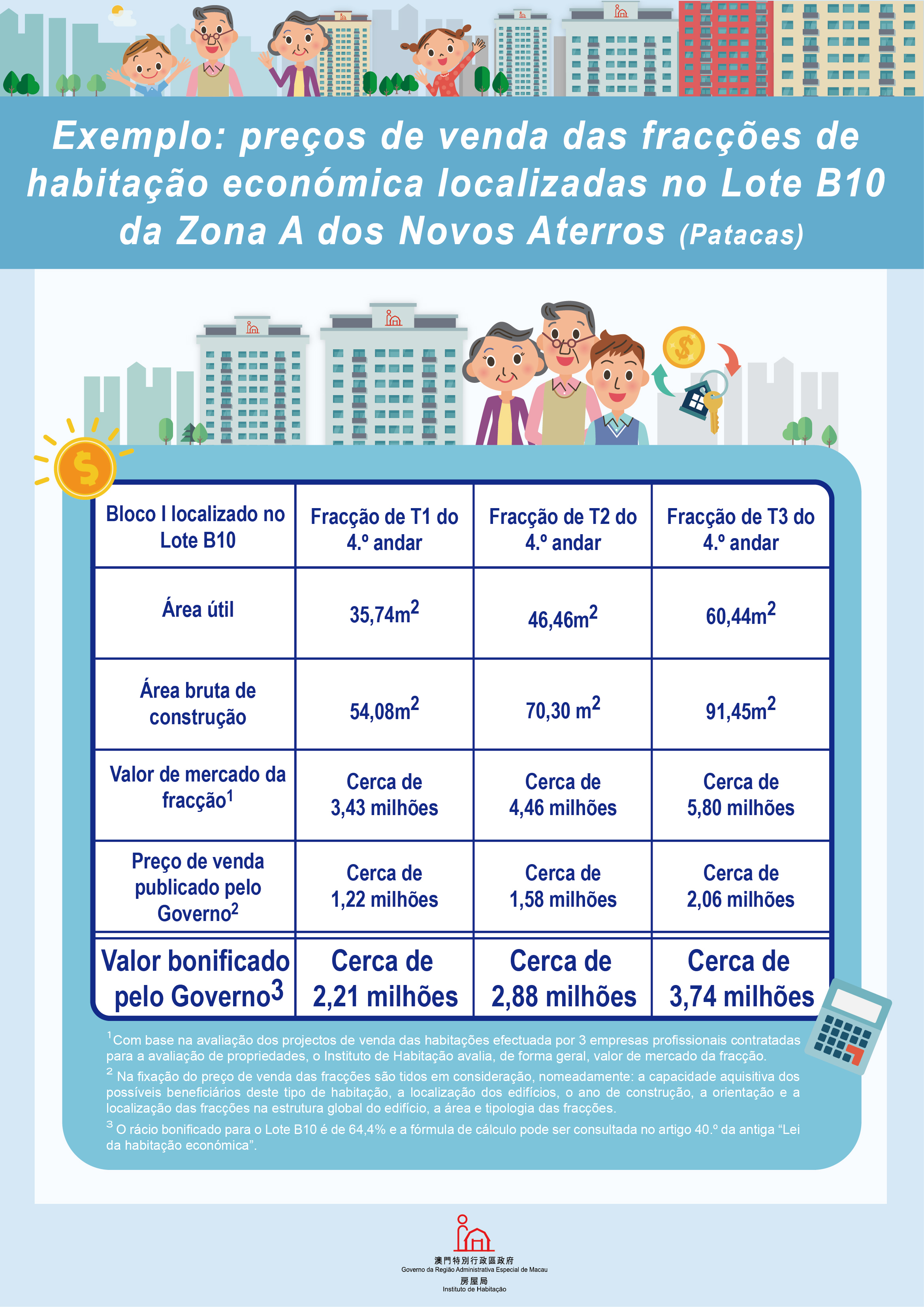 O cálculo concreto é efectuado de acordo com a amortização mensal estimada com base em 30% do actual limite mínimo do rendimento mensal (19 270 patacas) de um agregado familiar de 2 elementos candidato à habitação económica, um prazo de amortização de 20 anos, uma taxa de juros do empréstimo de 3,5% e uma percentagem do valor do empréstimo bancário de 70%, sendo, assim, calculado em 1 423 991 patacas o valor suportável para aquisição de uma habitação. Tendo o cálculo por base uma fracção com uma área útil de 40 metros quadrados, o preço da área útil por pé quadrado é de cerca de 3 300 patacas. De acordo com o valor base por pé quadrado, o preço concreto de venda, pode ser aumentado ou diminuído, dependendo da orientação, piso, localização, área e tipologia de cada fracção.