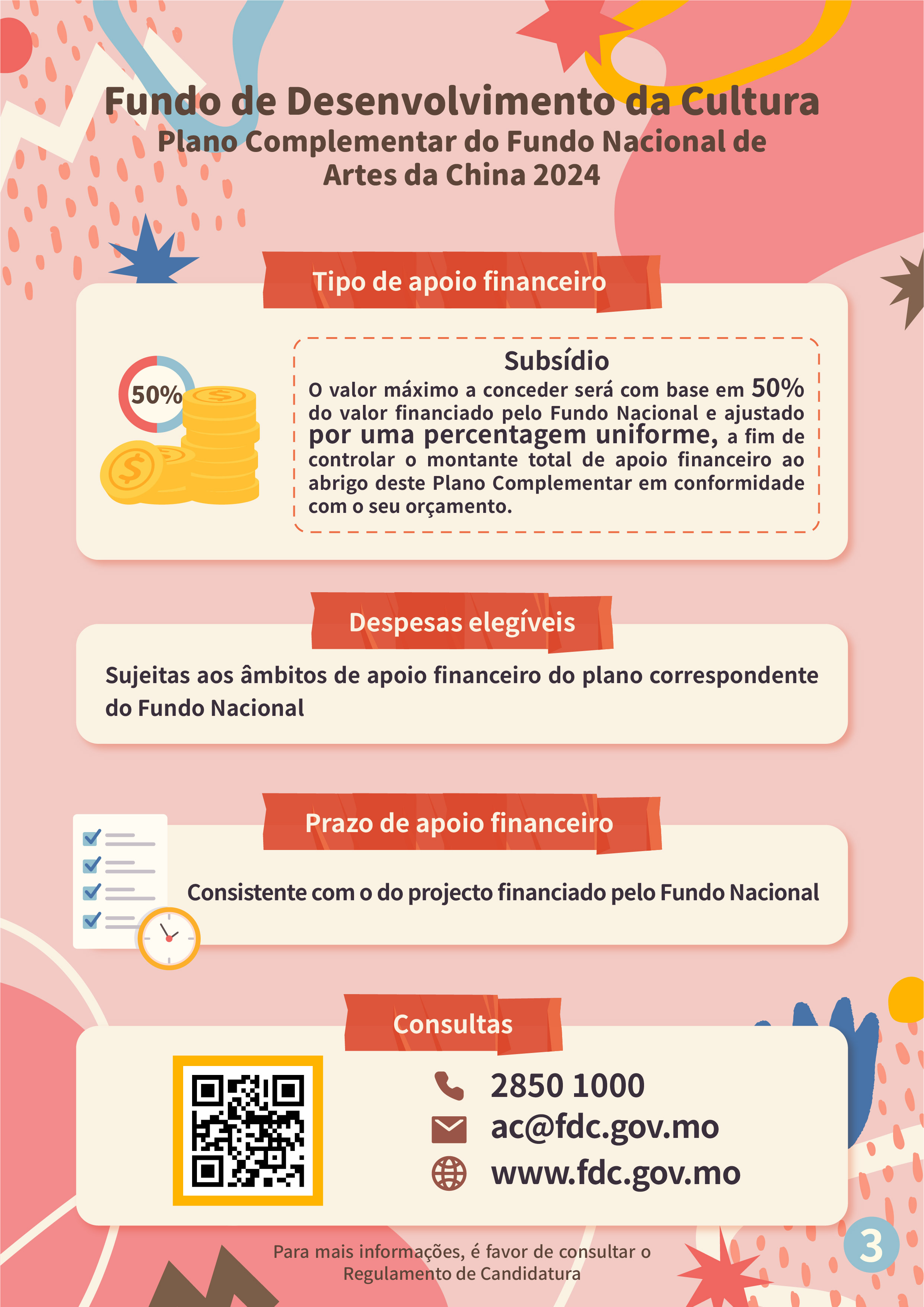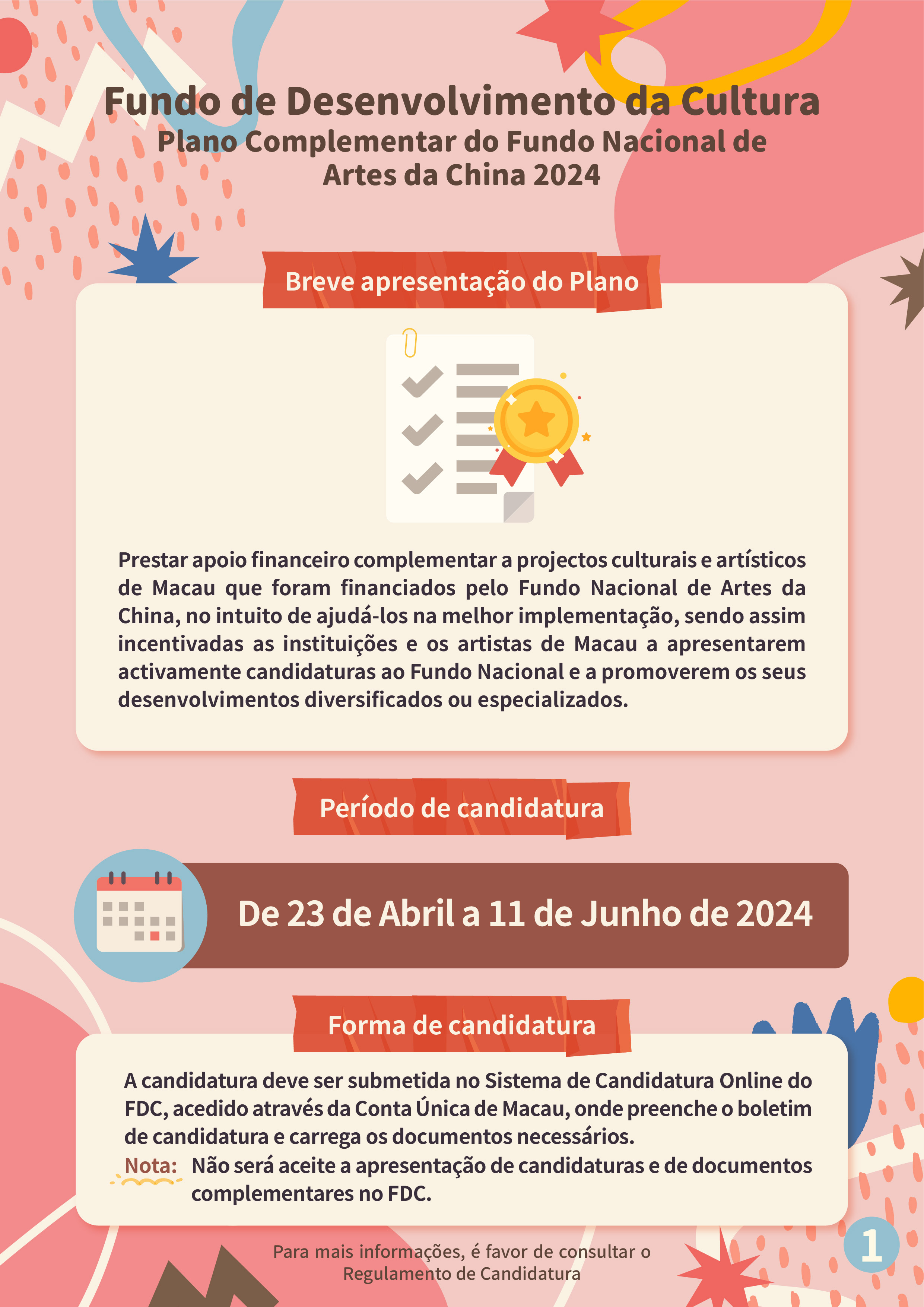 Com vista a apoiar a implementação dos projectos artísticos e culturais de Macau financiados pelo Fundo Nacional de Artes e, incentivar as organizações artísticas e os artistas de Macau a apresentarem activamente candidaturas ao mesmo, o Fundo de Desenvolvimento da Cultura (FDC) continua, no corrente ano, a lançar o “Plano complementar do Fundo Nacional de Artes da China”, com um período de candidatura de 23 de Abril a 11 de Junho.