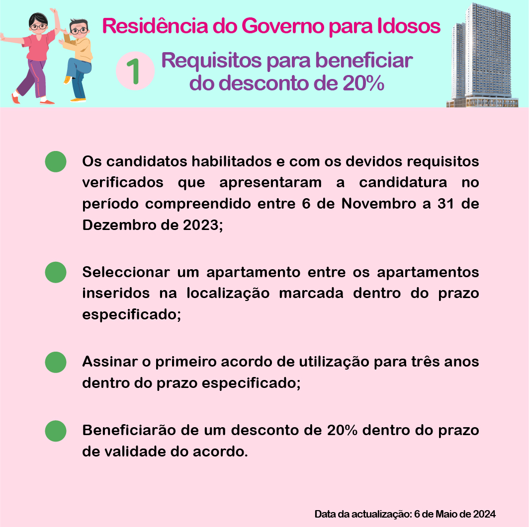 De acordo com o Despacho atrás referido, para os candidatos habilitados e com os devidos requisitos verificados que apresentaram a candidatura no período compreendido entre 6 de Novembro e 31 de Dezembro de 2023, a taxa de utilização do apartamento residencial da Residência do Governo para Idosos, durante o período de vigência do primeiro acordo de utilização de três anos é calculada com uma redução de 20% por mês, desde que o apartamento residencial inserido na localização marcada seja escolhido no prazo de 90 dias fixado pelo Instituto de Acção Social (IAS) e que o acordo de utilização seja assinado dentro do prazo indicado.
