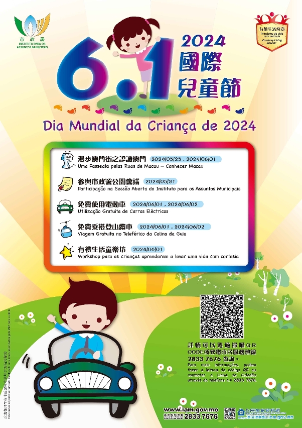 Com o intuito de celebrar o “Dia Mundial da Criança – 1 de Junho”, o Centro de Recursos de Educação Cívica do Instituto para os Assuntos Municipais (IAM) organizará nesta data uma série de actividades intituladas “Workshop para as crianças aprenderem a levar uma vida com cortesia”. Nos dois dias consecutivos de 1 e 2 de Junho, crianças acompanhadas pelos pais poderão ter acesso gratuito aos carrinhos eléctricos infantis no Jardim da Montanha Russa e Parque do Chunambeiro, bem como usufruir de transporte gratuito no teleférico da Colina da Guia. Todos os encarregados de educação são bem-vindos a participar nestas actividades com os seus filhos, para festejar o Dia da Criança.