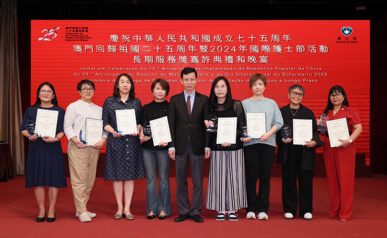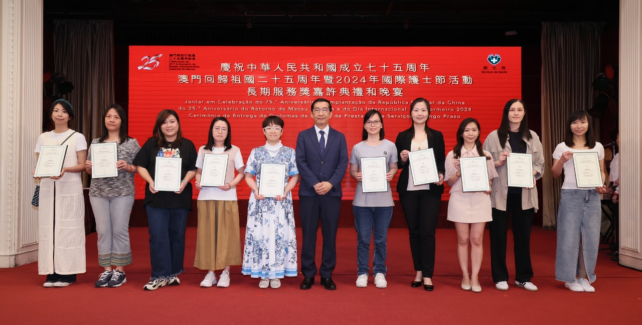 Os Serviços de Saúde realizaram recentemente, por ocasião do Dia Internacional do Enfermeiro 2024 (dia 12 de Maio de cada ano) , a Actividade para Celebração do 75.º Aniversário da Implantação da República Popular da China, do 25.º Aniversário do Retorno de Macau à Pátria e do Dia Internacional do Enfermeiro 2024 – Cerimónia de Entrega de Diplomas de Louvor de Prestação de Serviços a Longo Prazo, onde contou com a presença do Subdirector do Departamento de Propaganda e Cultura do Gabinete de Ligação do Governo Popular Central na RAEM, Yin Rutao, do Director dos Serviços de Saúde, Lo Iek Long, do Subdirector dos Serviços de Saúde, Kuok Cheong U, do Subdirector dos Serviços de Saúde, Cheang Seng Ip, do Subdirector dos Serviços de Saúde, Chan Weng Wa, entre outros, sendo que estes convidados atribuíram diplomas de louvor aos 60 enfermeiros que completaram 20 anos e 30 anos de serviço, demonstrando assim que o Governo da RAEM reconhece e elogia o seu contributo para o trabalho de enfermagem.