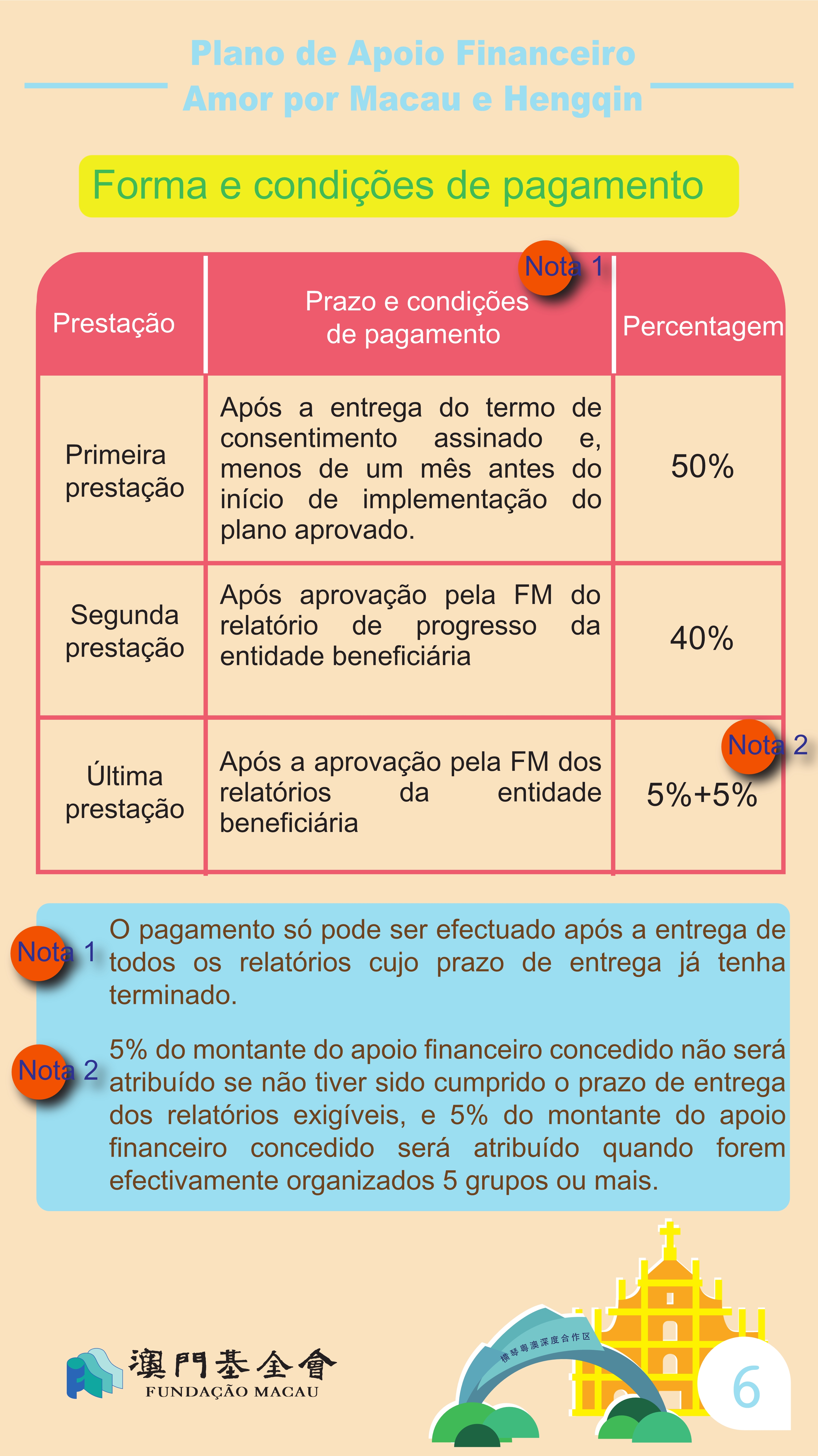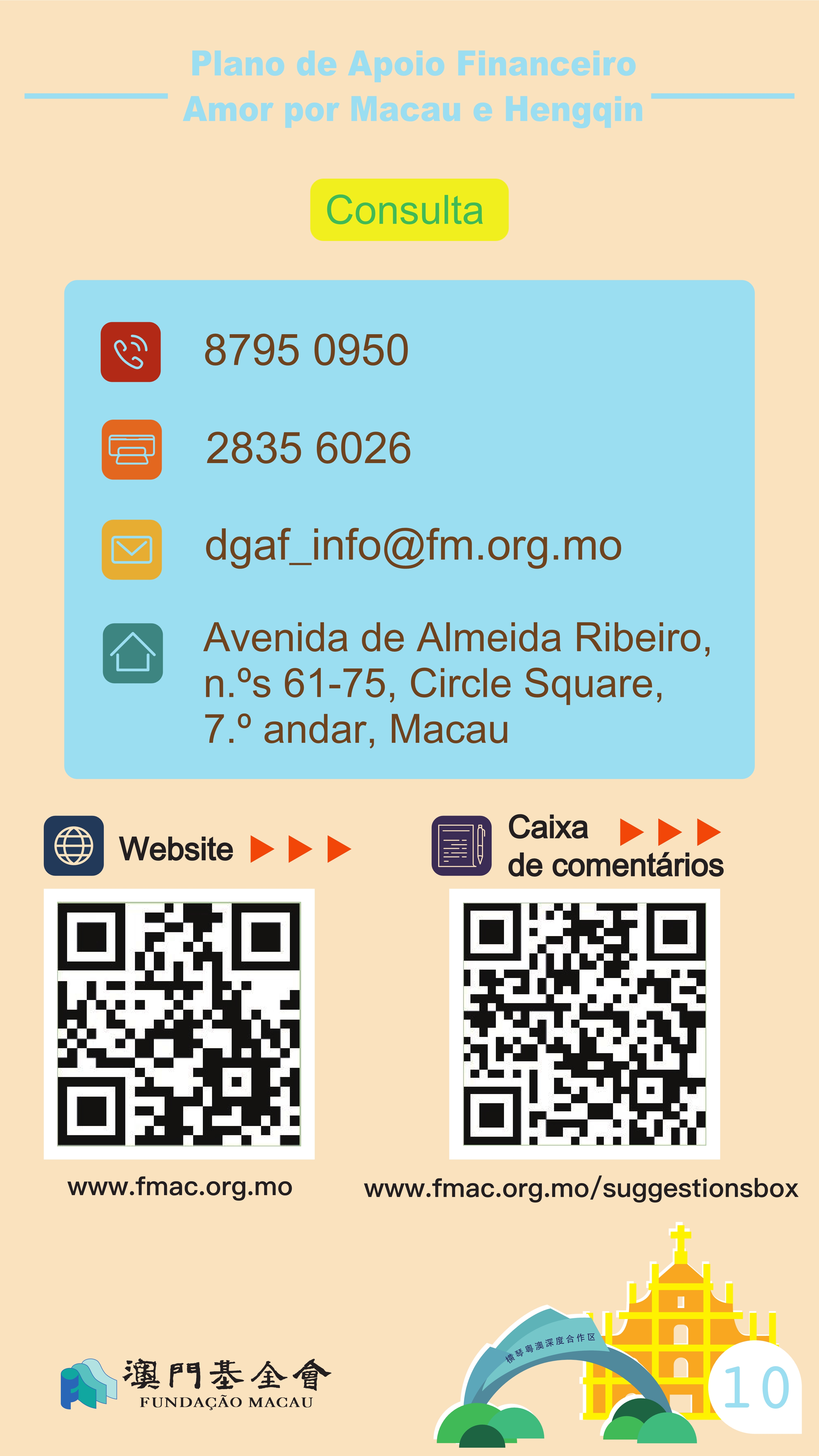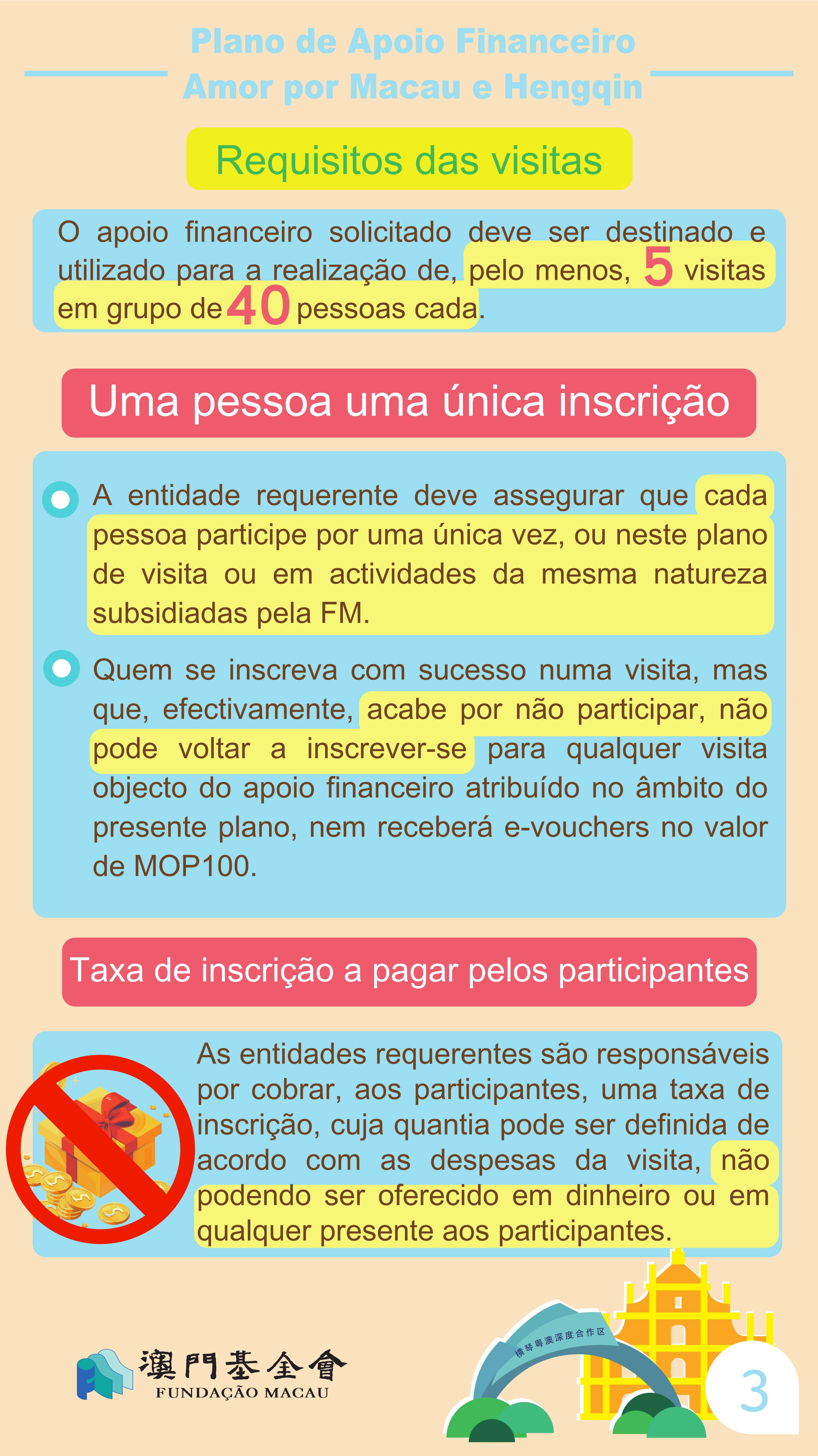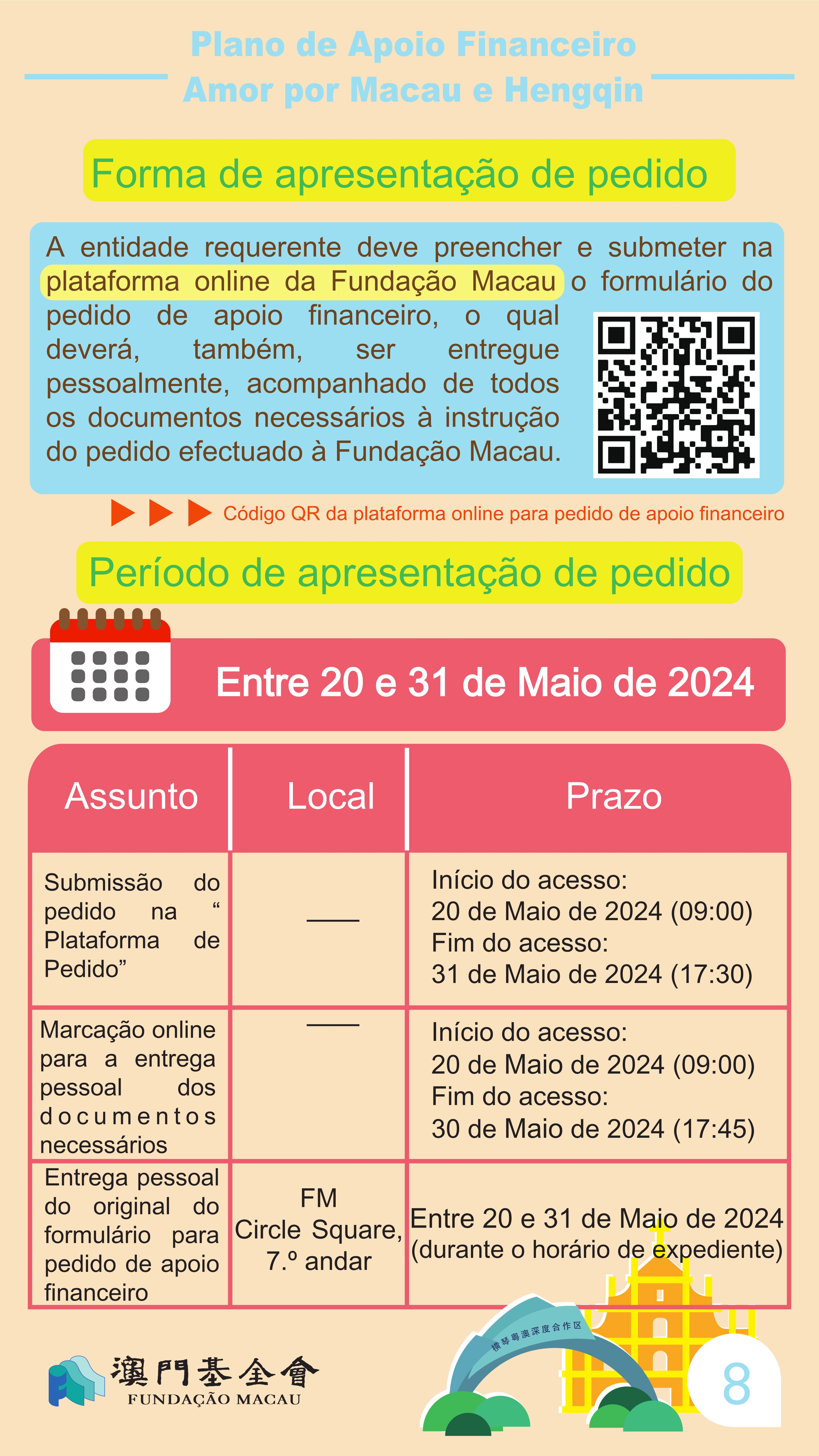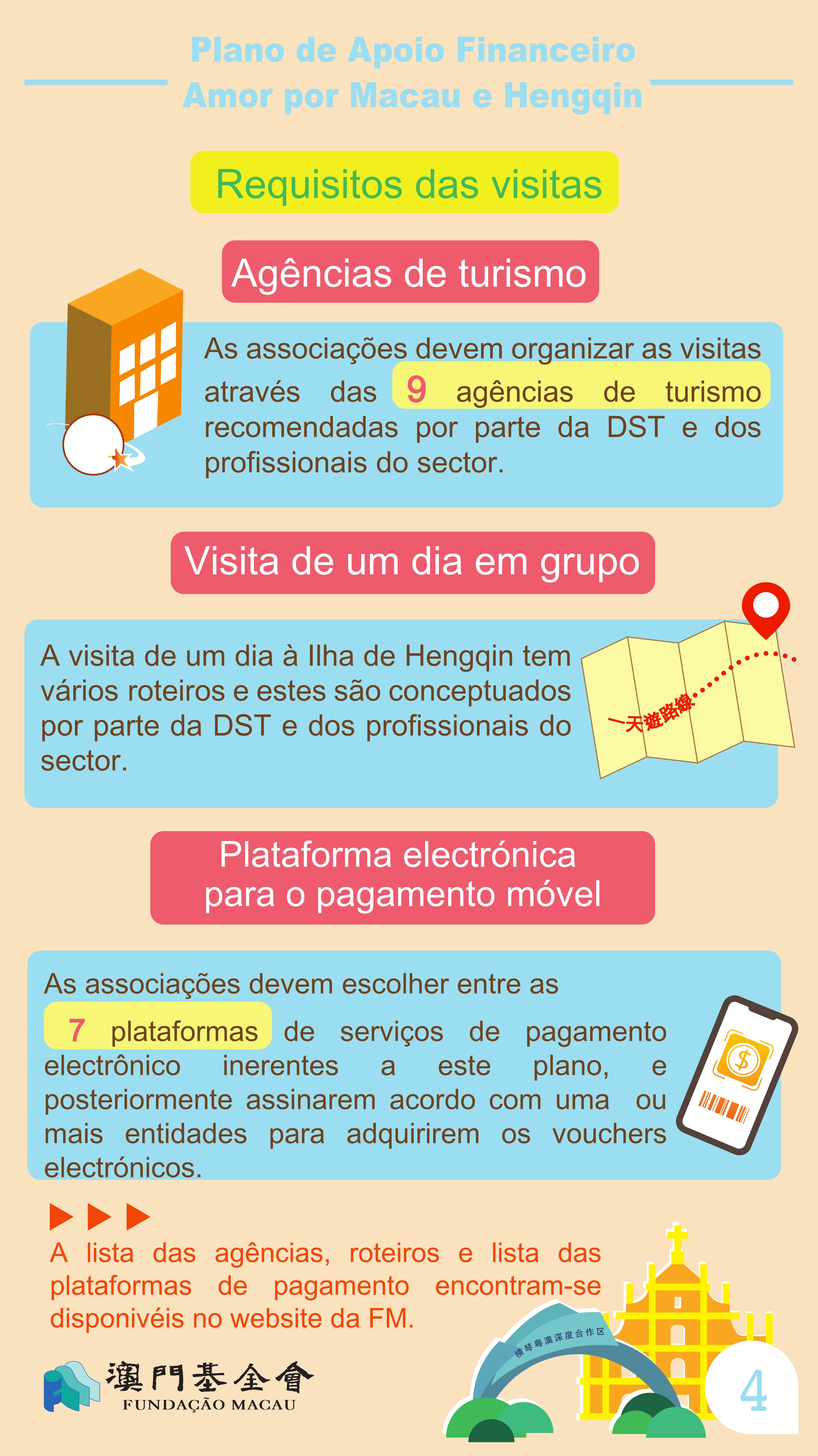 Com o objectivo de celebrar o 75º Aniversário da Implantação da República Popular da China, o 25º Aniversário do estabelecimento da Região Administrativa Especial de Macau e o 3º Aniversário do Estabelecimento da Zona de Cooperação Aprofundada entre Guangdong e Macau em Hengqin, de promover a integração de Macau e Hengqin, para estimular a economia comunitária de Macau, a Fundação Macau (doravante designado por FM) decidiu instituir o “Plano de Apoio Financeiro Amor por Macau e Hengqin” (doravante designado por Plano), para subsidiar associações que organizem visitas de um dia a Hengqin e oferecer vouchers electrónicos a serem consumidos em Macau.O período de candidatura a este plano vai de 20 a 31 de Maio de 2024.