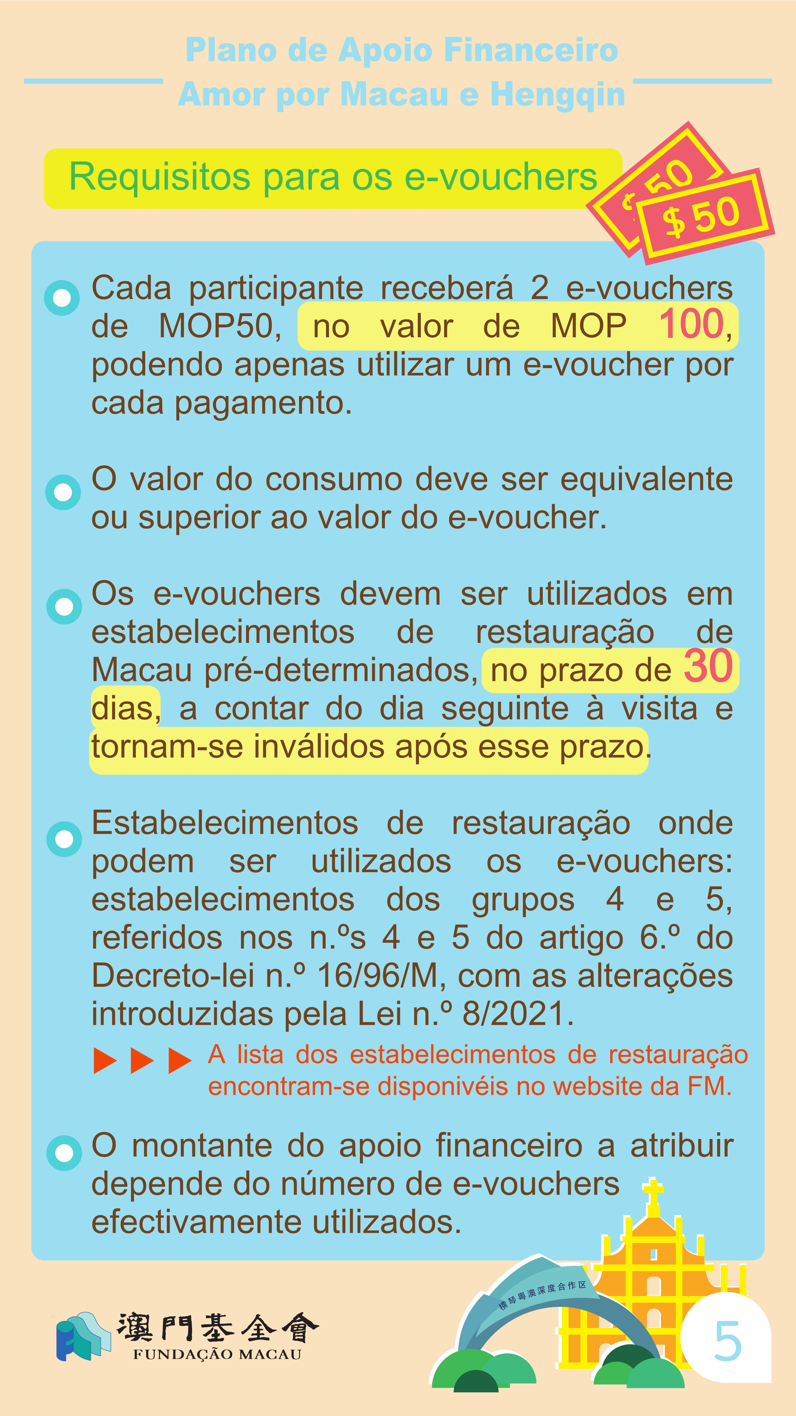 Cada residente da RAEM poderá apenas inscrever-se uma única vez, isto é ou na actividade acima referida ou nas actividades da mesma natureza subsidiadas pela Fundação (incluíndo as visitas de intercâmbio à Zona de cooperação aprofundada e atribuição dos e-vouchers electrónicos) . Serão atribuídos aos participantes dois vouchers electrónicos de MOP50 para consumo em determinados restaurantes na RAEM. Somente é permitido utilizar um e-voucher por consumo, e os mesmos têm validade de 30 dias a contar do dia seguinte ao da visita. Os inscritos mas que não puderam participar na visita, considera-se como tendo usufruído do apoio financeiro, e não poderão receber os vouchers electrónicos de MOP100.