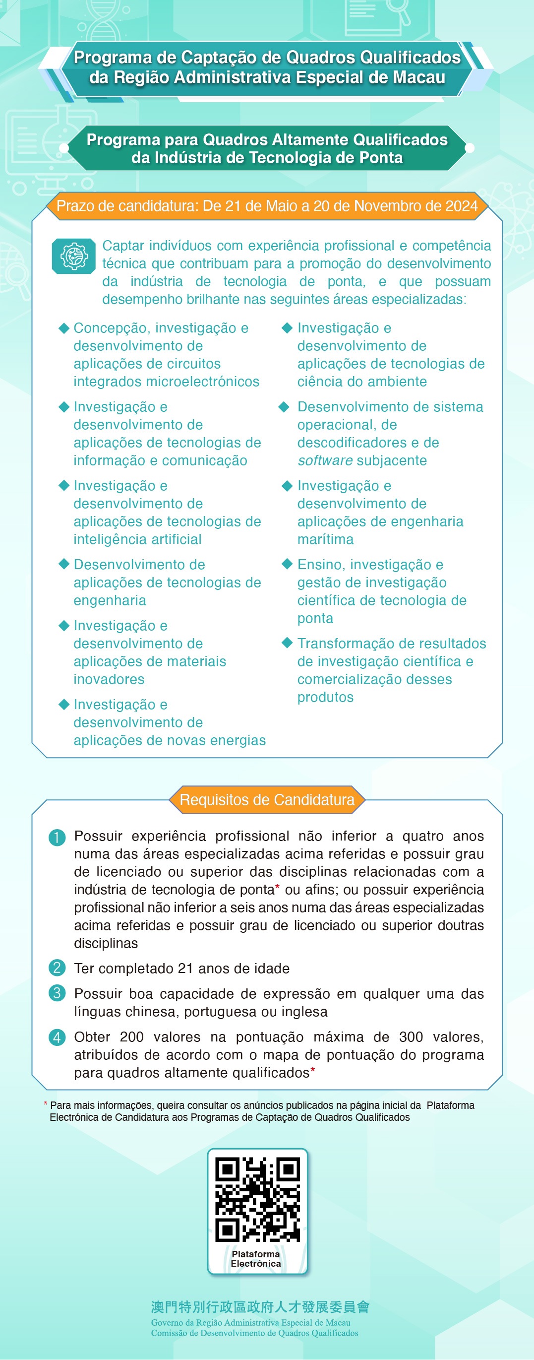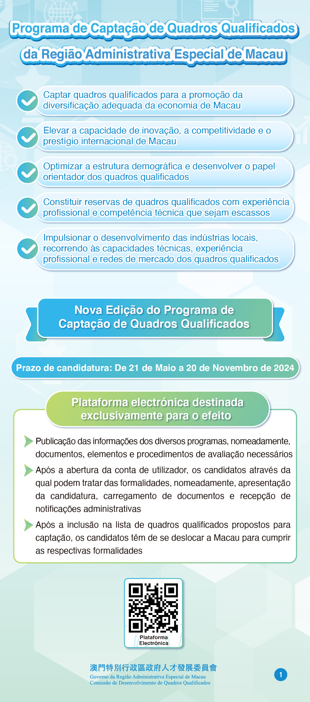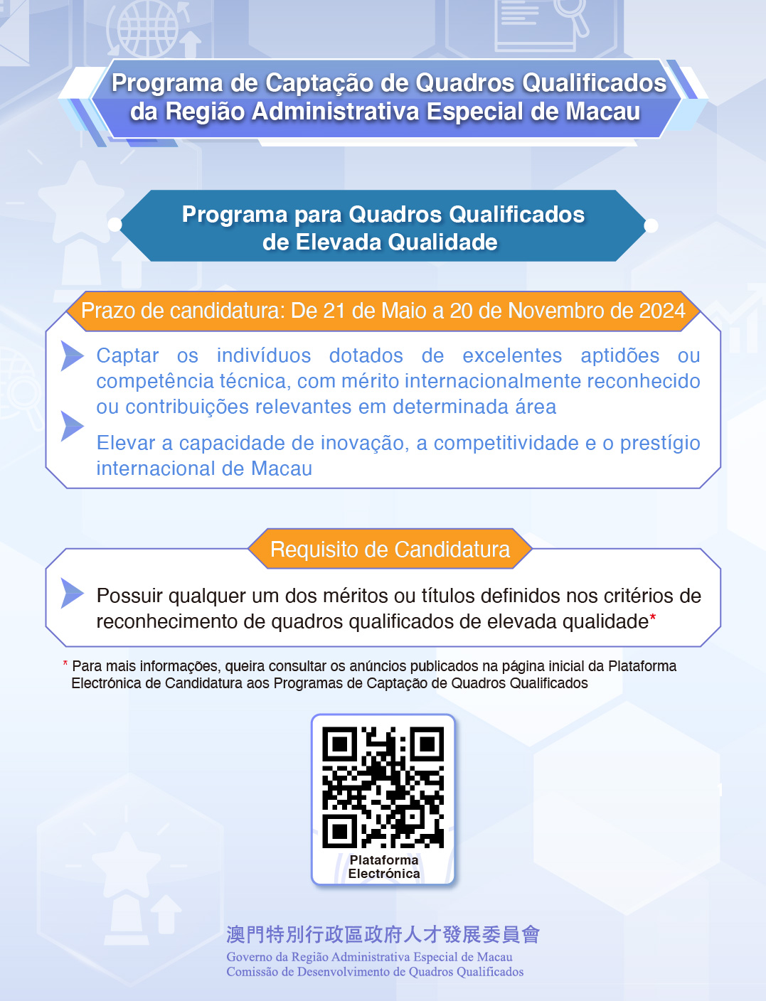 Com o intuito de promover a diversificação adequada da economia “1+4”, elevar a capacidade inovadora, a competitividade e o prestígio internacional da Região Administrativa Especial de Macau (RAEM) e acelerar o desenvolvimento das indústrias locais e o progresso a longo prazo da sociedade, o Governo da RAEM implementa uma nova fase do Programa de Captação de Quadros Qualificados e anuncia a abertura, entre 21 de Maio e 20 de Novembro de 2024, de candidaturas para um total de nove programas para três tipos de quadros qualificados, os quais compreendem um Programa para Quadros Qualificados de Elevada Qualidade, quatro Programas para Quadros Altamente Qualificados da indústria de big health, da indústria de tecnologia de ponta, da indústria de finanças modernas e das indústrias cultural, desportiva e outras indústrias, e quatro Programas para Profissionais de Nível Avançado das mesmas indústrias.