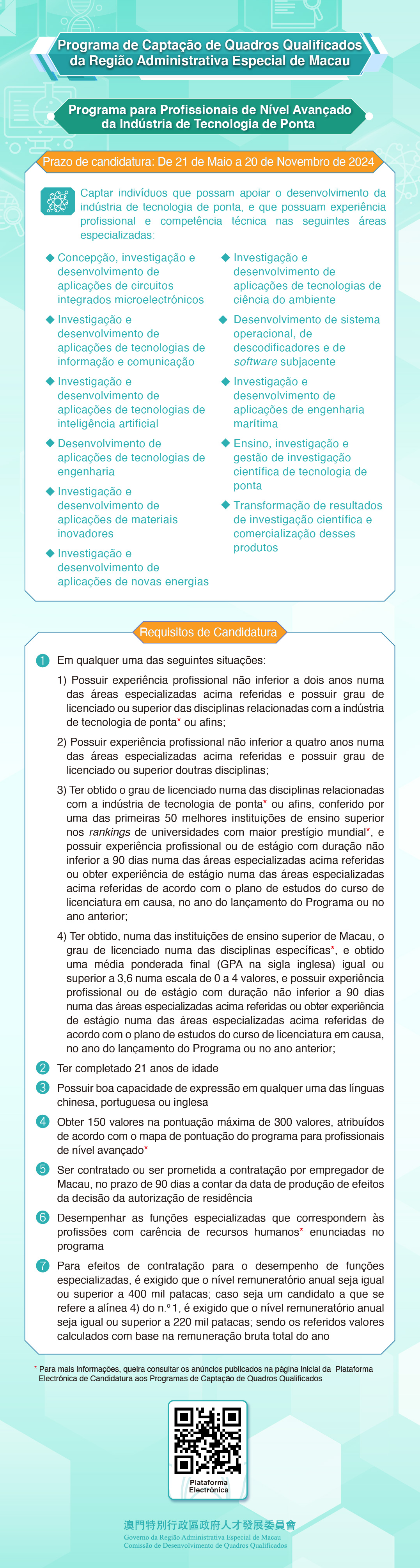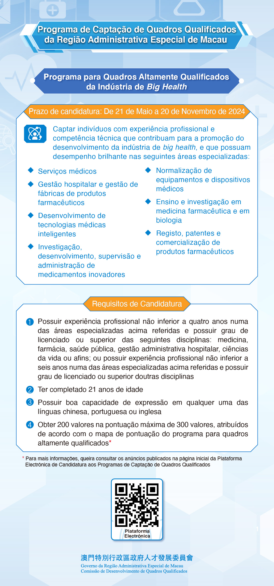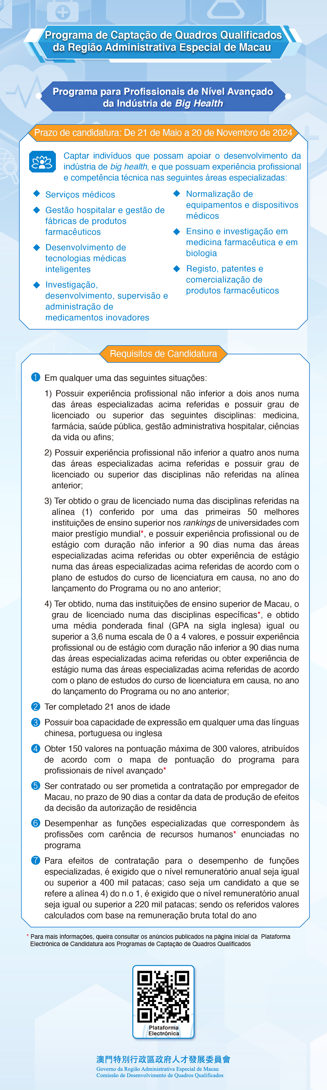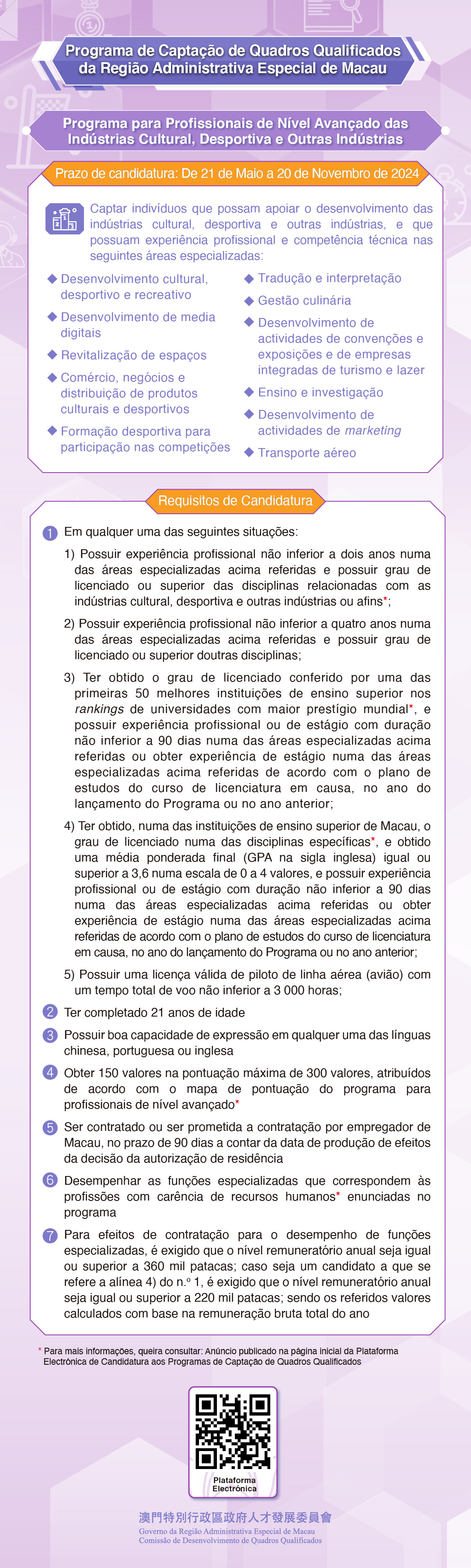 Com o intuito de promover a diversificação adequada da economia “1+4”, elevar a capacidade inovadora, a competitividade e o prestígio internacional da Região Administrativa Especial de Macau (RAEM) e acelerar o desenvolvimento das indústrias locais e o progresso a longo prazo da sociedade, o Governo da RAEM implementa uma nova fase do Programa de Captação de Quadros Qualificados e anuncia a abertura, entre 21 de Maio e 20 de Novembro de 2024, de candidaturas para um total de nove programas para três tipos de quadros qualificados, os quais compreendem um Programa para Quadros Qualificados de Elevada Qualidade, quatro Programas para Quadros Altamente Qualificados da indústria de big health, da indústria de tecnologia de ponta, da indústria de finanças modernas e das indústrias cultural, desportiva e outras indústrias, e quatro Programas para Profissionais de Nível Avançado das mesmas indústrias.