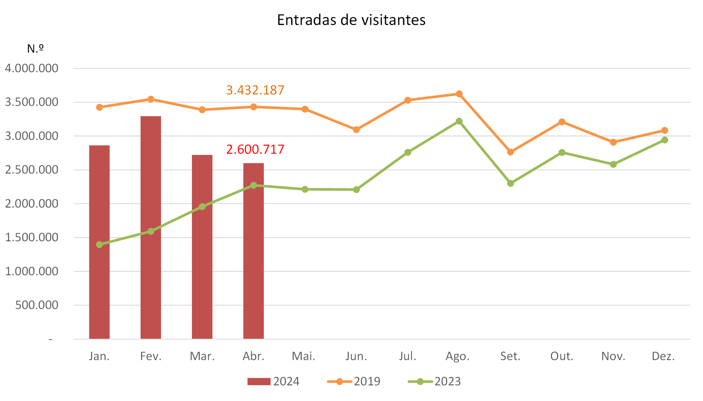 Nos quatro primeiros meses de 2024 o número de entradas de visitantes em Macau totalizou 11.476.474, mais 58,9%, face ao período homólogo de 2023, registando-se uma recuperação de 83,2% do número de entradas de visitantes do mesmo período de 2019. Realça-se que o número de entradas de excursionistas (6.141.648) e o de turistas (5.334.826) subiram 80,3% e 39,8%, respectivamente. O período médio de permanência dos visitantes foi de 1,2 dias, menos 0,1 dias, em relação ao idêntico período de 2023. Salienta-se que o período médio de permanência dos turistas (2,2 dias) e o dos excursionistas (0,2 dias) baixaram ambos 0,1 dias.