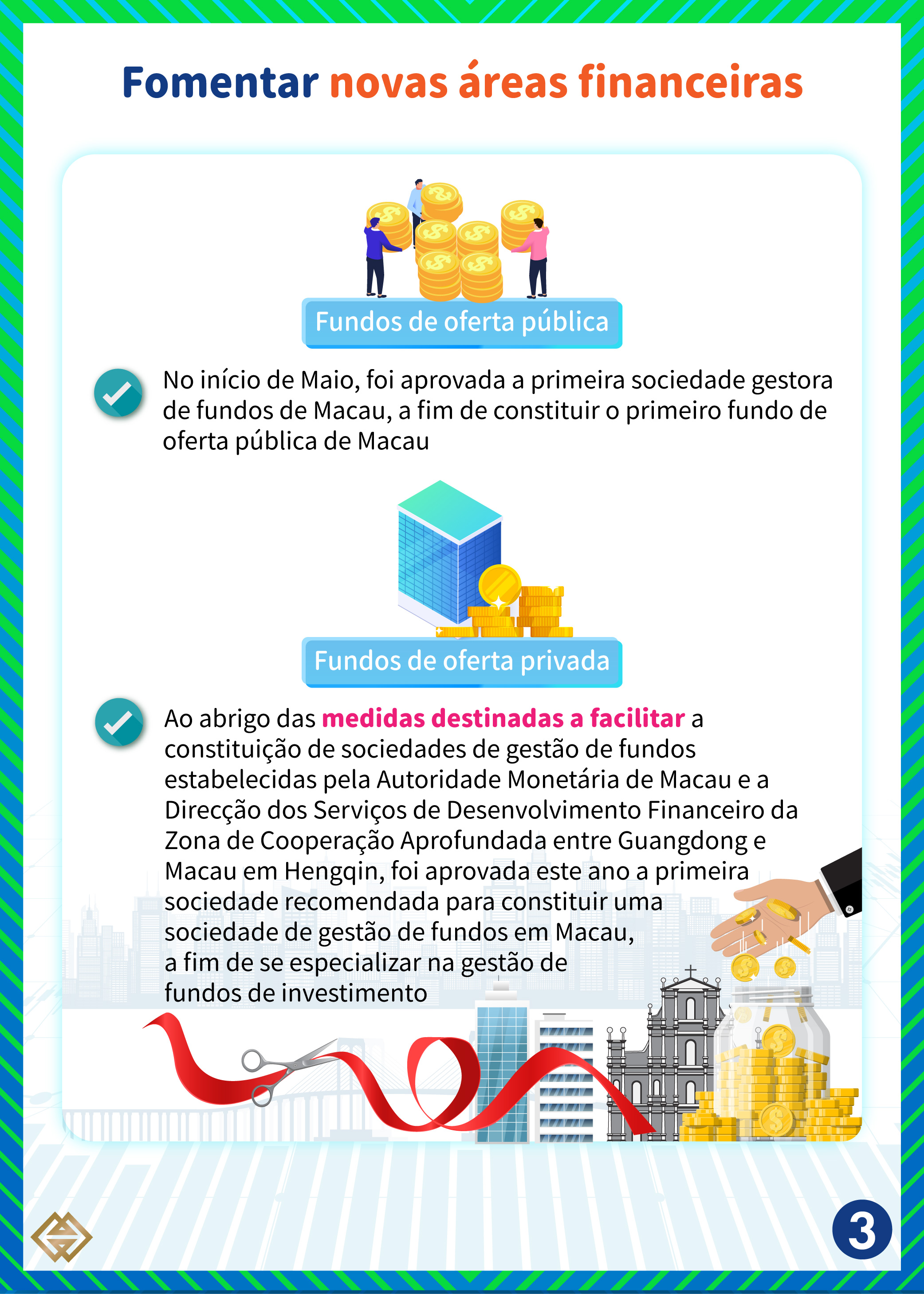 Com a optimização gradual das leis e regulamentos relacionados com a actividade de gestão de fortunas, este ano foram realizados novos desenvolvimentos nas áreas da gestão de fundos de oferta pública e fundos de oferta privada. No início deste mês, foi aprovada a primeira sociedade gestora de fundos de Macau, a fim de constituir o primeiro fundo de oferta pública de Macau. O regulamento de gestão do fundo foi tornado público. No que respeita aos fundos de oferta privada, ao abrigo das medidas destinadas a facilitar a constituição de sociedades de gestão de fundos estabelecidas pela Autoridade Monetária de Macau e a Direcção dos Serviços de Desenvolvimento Financeiro da Zona de Cooperação Aprofundada entre Guangdong e Macau em Hengqin, foi aprovada este ano a primeira sociedade recomendada para constituir uma sociedade de gestão de fundos em Macau, a fim de se especializar na gestão de fundos de investimento.
