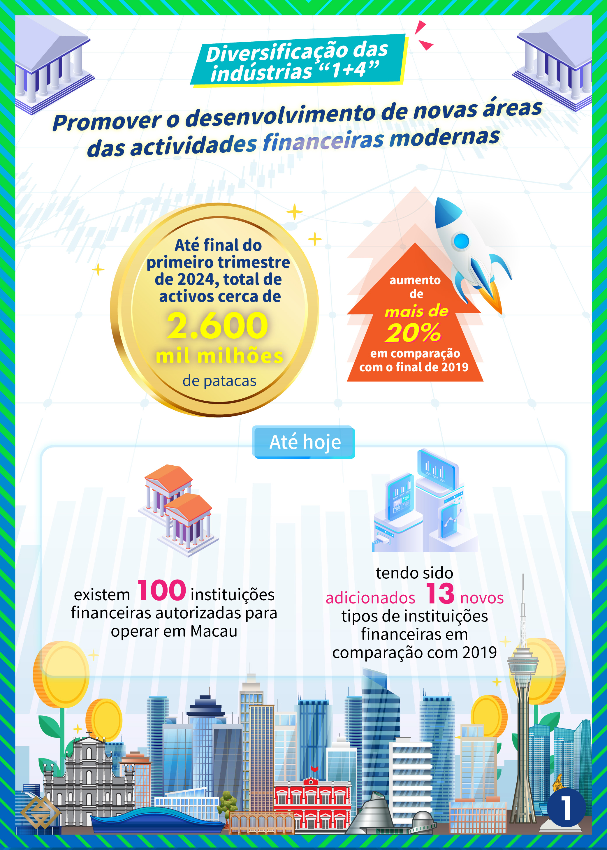 Tirando melhor proveito das suas próprias vantagens, enquanto um sistema financeiro altamente aberto ao exterior e um sistema de gestão financeiro interligado internacionalmente, Macau tem continuado a introduzir novos tipos de instituições financeiras e o sector financeiro tem-se tornado cada vez mais diversificado. De acordo com as estatísticas preliminares, no final do primeiro trimestre do ano corrente, o total de activos do sector financeiro de Macau ascendia a cerca de 2.600 mil milhões de patacas, o que representa um aumento de mais de 20%, em comparação com o final de 2019, anterior à epidemia. Até à data, existem 100 instituições financeiras autorizadas para operar em Macau, tendo sido adicionados 13 novos tipos de instituições financeiras, em comparação com 2019.