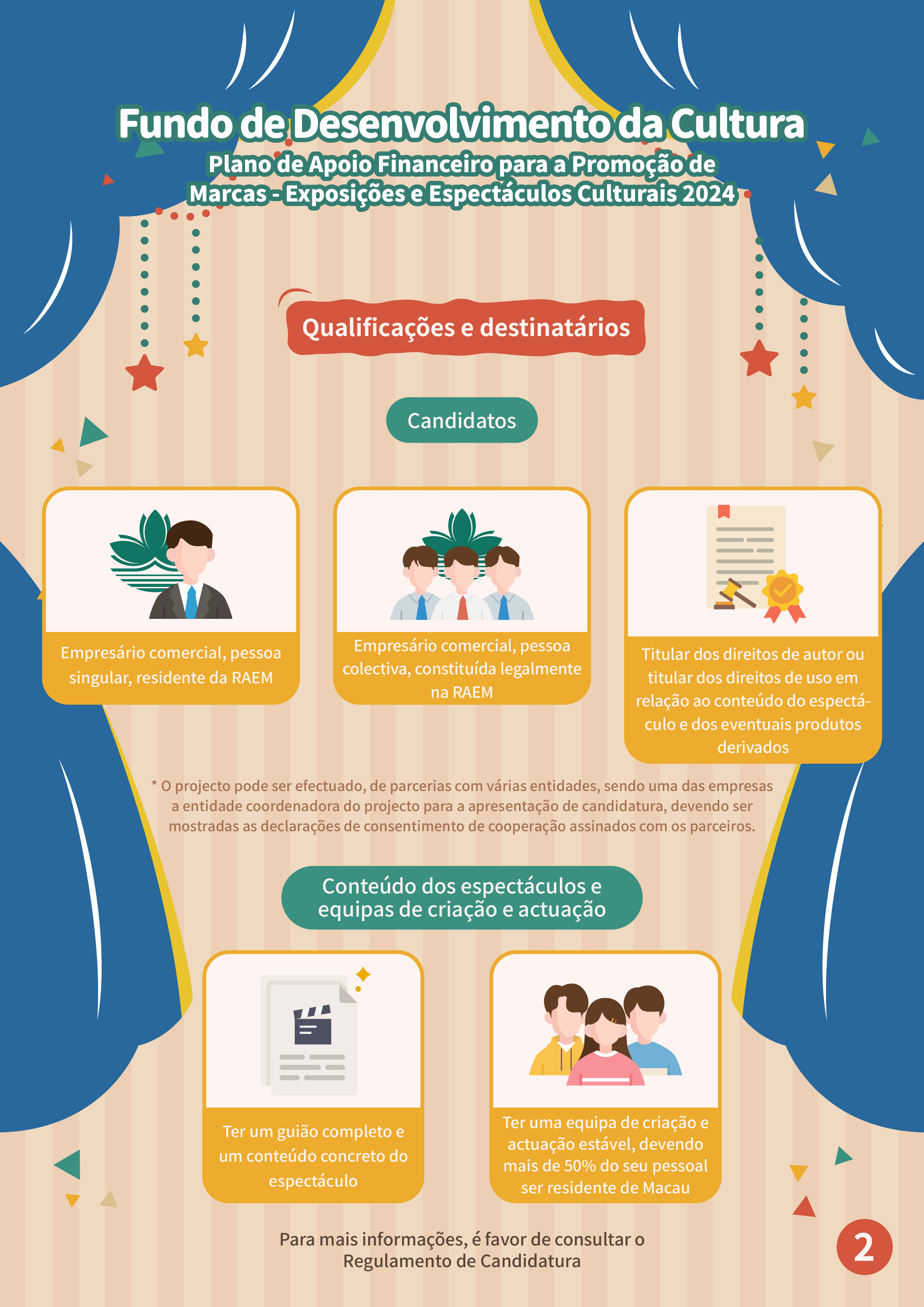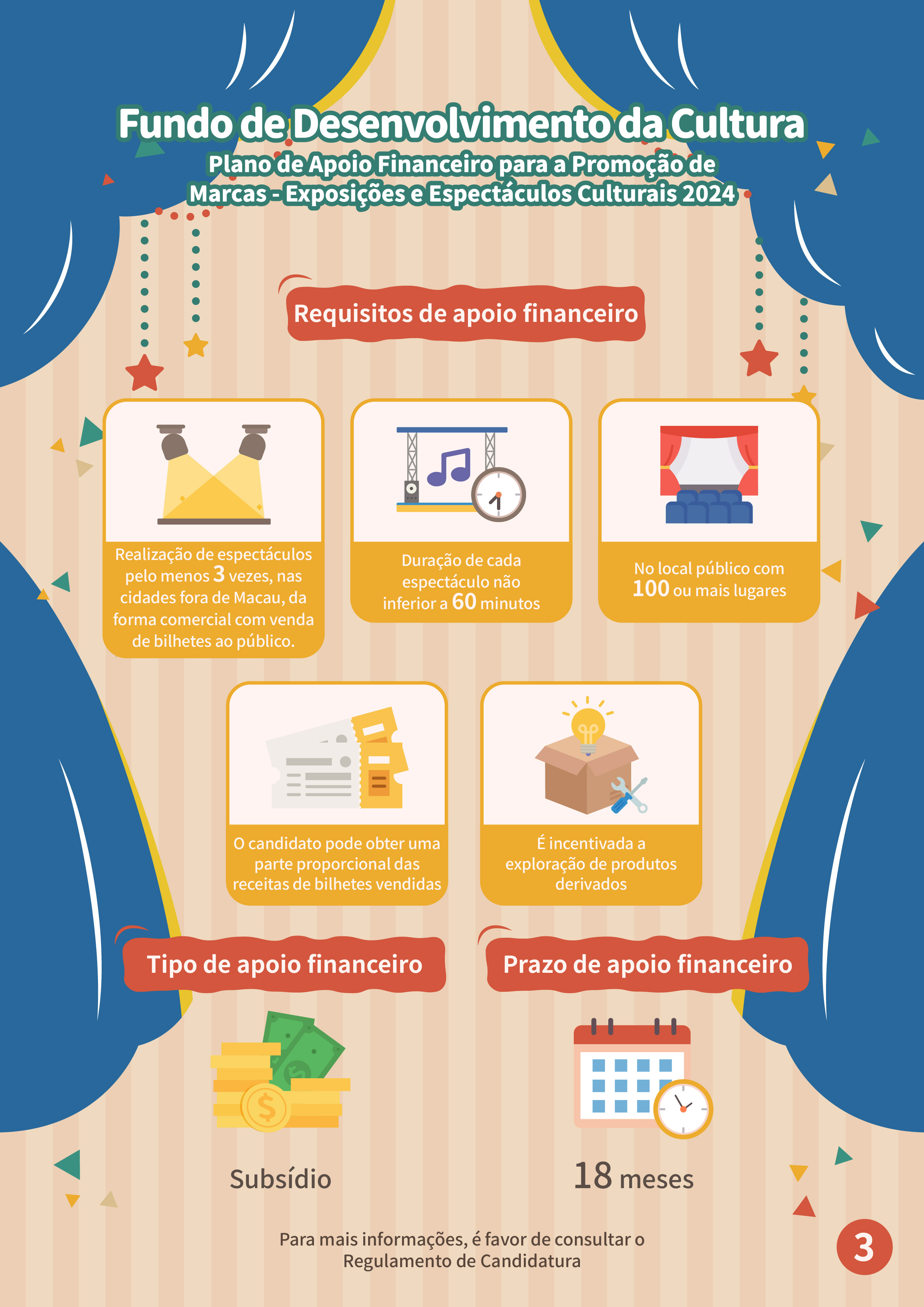 O “Plano de Apoio Financeiro para a Promoção de Marcas - Exposições e Espectáculos Culturais 2024” visa promover as entidades da área de exposição e espectáculo culturais de Macau a transformarem a operação de forma comercial e, aproveitar a cooperação regional para impulsionar a realização de espectáculos comerciais nos mercados estrangeiros por marcas de Macau, especialmente nas regiões de “Grande Baía Guangdong/Hong Kong/Macau” e de “Uma faixa, uma rota”, aumentando assim a visibilidade e popularidade das marcas nos mercados fora de Macau, no intuito de promover a industrialização do sector.