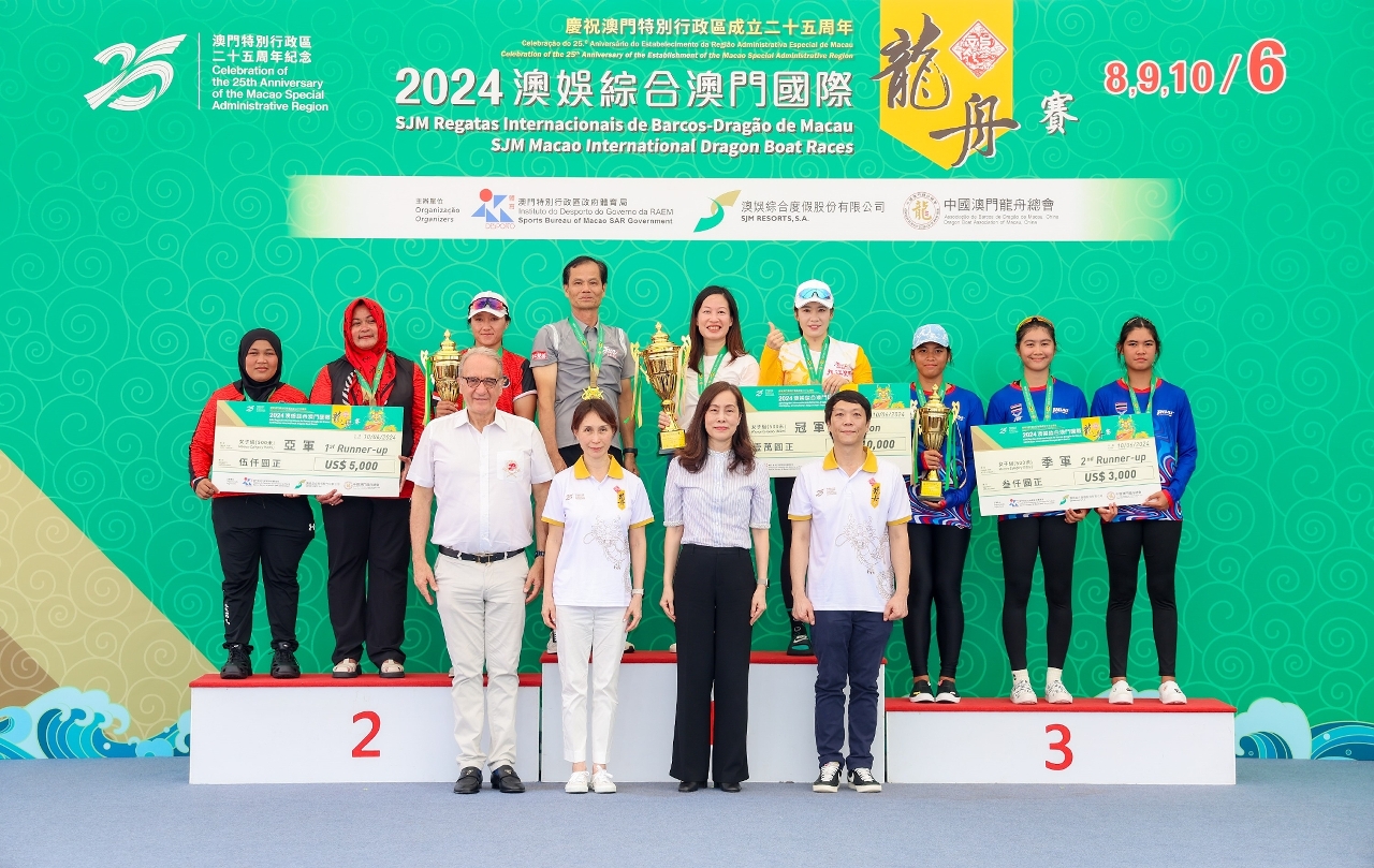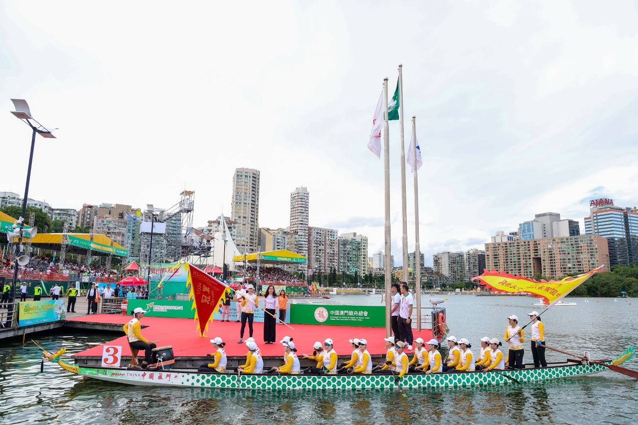 Co-organizada pelo Instituto do Desporto, pela SJM Resorts, S.A. e pela Associação de Barcos-Dragão de Macau, China, em colaboração com o Instituto para os Assuntos Municipais e a Direcção dos Serviços de Administração e Função Pública, a “Celebração do 25.º Aniversário do Estabelecimento da RAEM - SJM Regatas Internacionais de Barcos-Dragão de Macau 2024” decorreram hoje (dia 10) no Centro Náutico da Praia Grande as últimas provas. Depois de várias competições, a China Nanhai Jiujiang defendeu os títulos de campeão tanto na Categoria Open como na Categoria Senhoras da Regata Internacional de Barcos-Dragão de Macau por Convite para Grandes Embarcações – 500m, e a Liaocheng University sagrou-se campeã na Categoria Open da Regata Universitária de Barcos-Dragão de Macau por Convite para Grandes Embarcações – 500m. O Chefe do Executivo da RAEM Sr. Ho Iat Seng esteve presente neste evento para apreciar as provas e presidiu à cerimónia de vivificação e à entrega de prémios.