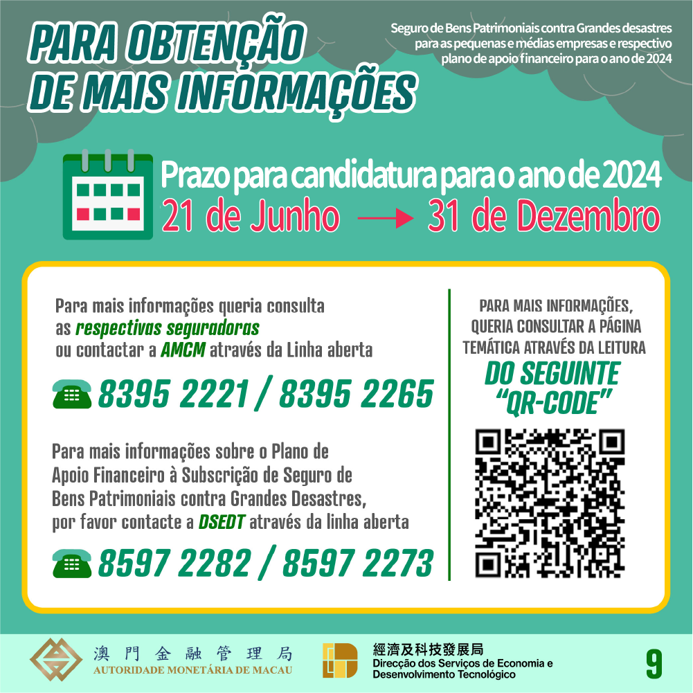A página oficial da AMCM foi actualizada, constando informações detalhadas relativas ao “Seguro contra grandes desastres” para o ano de 2024, a lista das seguradoras autorizadas para prestar o referido seguro, bem como as informações sobre o Plano de apoio financeiro ( https://www.amcm.gov.mo/pt/about-amcm/about-amcm-typhoon-information?type=SME-Catastrophe-Property-Insurance-and-Subsidy-Scheme ). Para prestação de quaisquer esclarecimentos sobre o “Seguro contra grandes desastres”, queira, por favor, contactar, directamente as seguradoras em apreço, ou solicitar, durante o horário de expediente, informações sobre os seguintes assuntos junto da respectiva entidade competente: