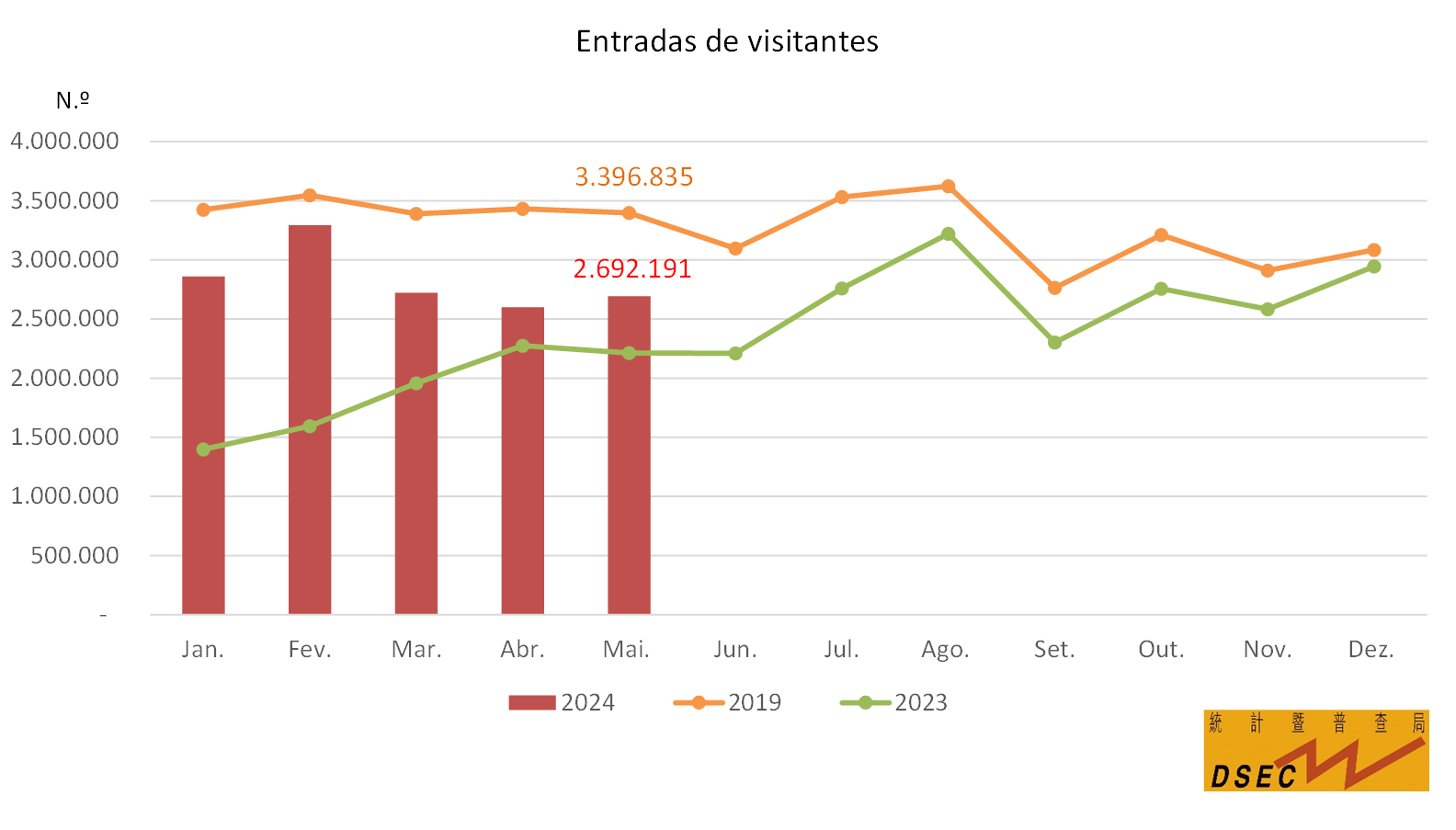 Nos cinco primeiros meses de 2024 o número de entradas de visitantes em Macau totalizou 14.168.665, mais 50,2%, face ao período homólogo de 2023, registando-se uma recuperação de 82,4% do número de entradas de visitantes do mesmo período de 2019. Realça-se que o número de entradas de excursionistas (7.572.389) e o de turistas (6.596.276) subiram 67,1% e 34,5%, respectivamente. O período médio de permanência dos visitantes foi de 1,2 dias, menos 0,1 dias, em relação ao idêntico período de 2023. Salienta-se que o período médio de permanência dos turistas (2,2 dias) e o dos excursionistas (0,2 dias) baixaram ambos 0,1 dias.