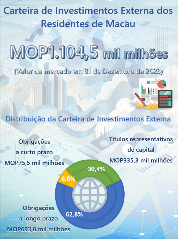 Nas estatísticas divulgadas hoje (dia 26) pela Autoridade Monetária de Macau (AMCM) constata-se que os investimentos dos residentes de Macau - incluindo os indivíduos, governo e outras pessoas colectivas, mas excluindo as reservas cambiais da Região Administrativa Especial de Macau - em títulos emitidos por entidades não residentes independentes, calculados a preços de mercado em 31 de Dezembro de 2023, registaram um valor de 1.104,5 mil milhões de patacas, ou seja, +3,0% face a 30 de Junho de 2023 e +9,7% face ao final de 2022. Entre os vários componentes da carteira, os investimentos em títulos representativos de capital (incluindo fundos mútuos e investimentos em trusts), obrigações a longo prazo e obrigações a curto prazo alcançaram 335,3 mil milhões, 693,8 mil milhões e 75,5 mil milhões de patacas, respectivamente, em valor de mercado, traduzindo variações respectivas de +4,4%, +16,5% e -16,4%, em relação ao final de 2022.
