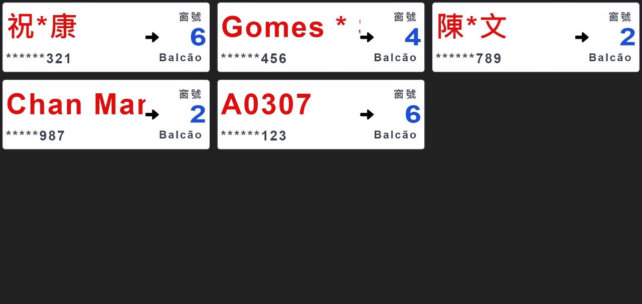 - Não será exibido o nome, apenas será exibido o número da senha, por exemplo: A0307.