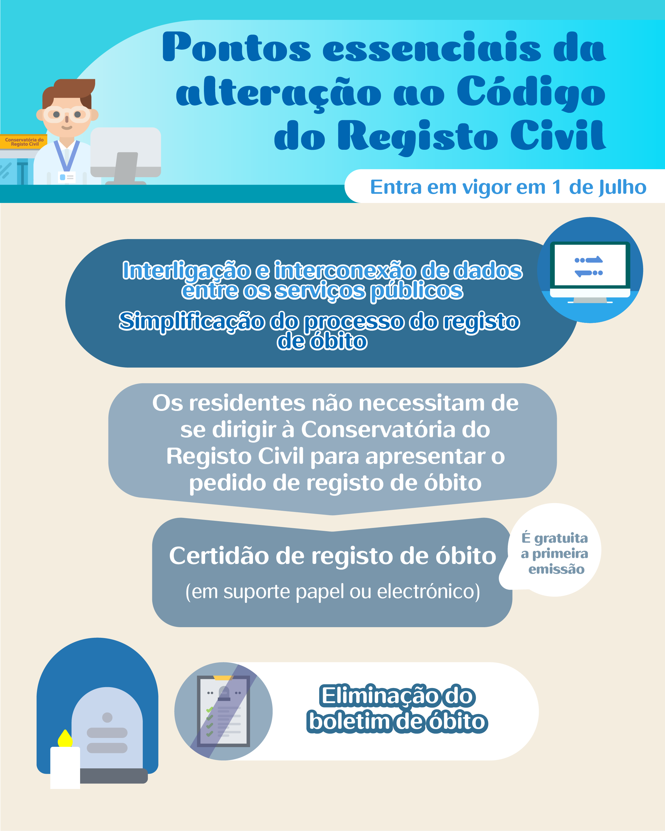 Esta nova lei já entrou em vigor em 1 de Julho de 2024, através da qual, ir-se-á reforçar a colaboração e a interligação de dados entre a Conservatória do Registo Civil e os hospitais e serviços públicos, simplificar o processo de pedido e reduzir o número de documentos necessários a apresentar, promover a electronização dos procedimentos e serviços de registo, no intuito de facilitar a vida da população e elevar a eficiência administrativa.