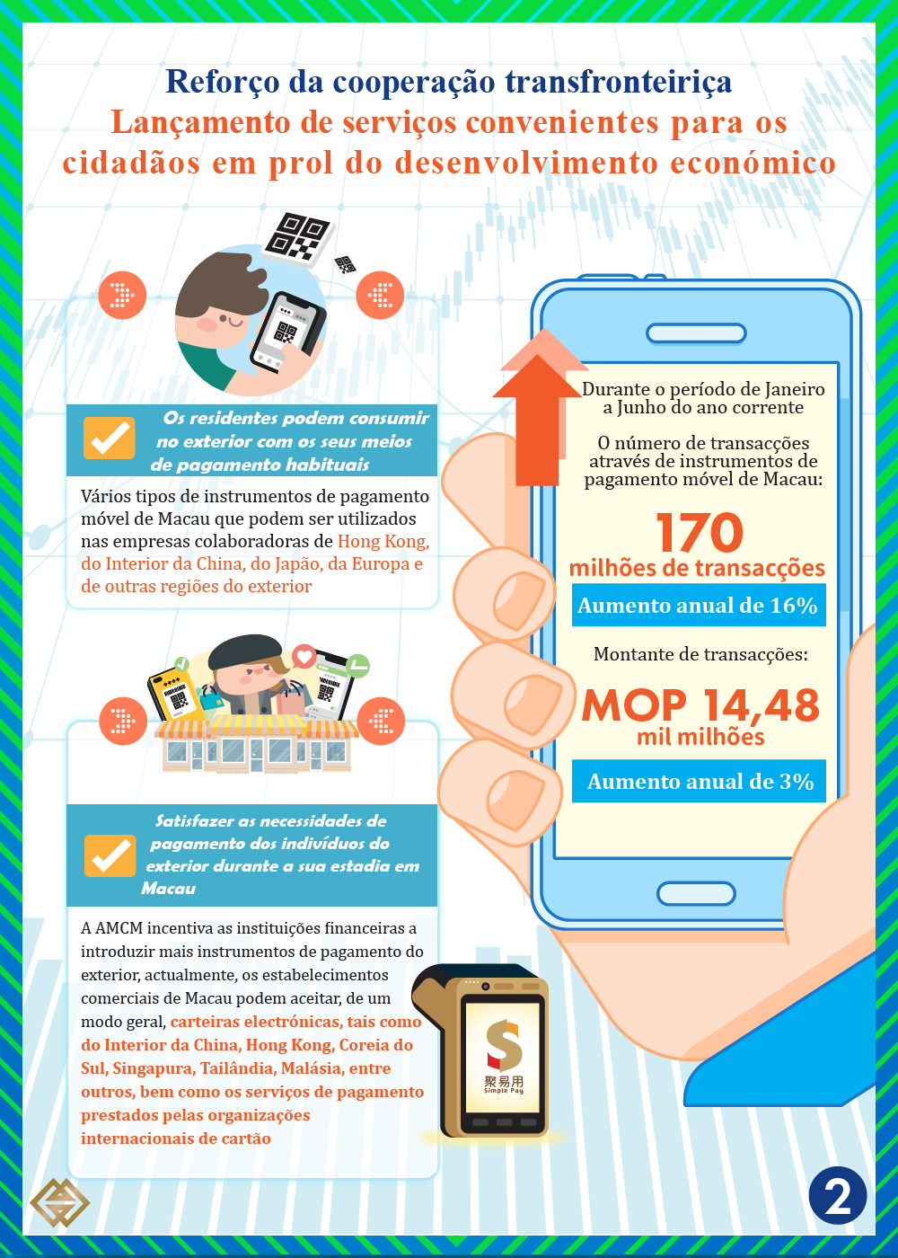 A AMCM incentiva as instituições financeiras a aperfeiçoar, de forma constante, os serviços de pagamento transfronteiriço, enriquecendo as áreas em que podem ser utilizados os instrumentos de pagamento móvel de Macau.  Actualmente, verificam-se vários tipos de instrumentos de pagamento móvel de Macau que podem ser utilizados nas empresas colaboradoras de outras regiões do exterior, tais como Hong Kong, do Interior da China, do Japão, da Europa etc., permitindo que os residentes possam consumir no exterior com os seus meios de pagamento habituais.  Durante o período de Janeiro a Junho do ano corrente, foram registadas 170 milhões de transacções, com um valor de MOP14,48 mil milhões, representando um aumento anual de 16% e 3%, respectivamente.  Por outro lado, as instituições financeiras foram impulsionadas a introduzir mais instrumentos de pagamento do exterior, presentemente, os estabelecimentos comerciais de Macau podem aceitar, de um modo geral, carteiras electrónicas, tais como do Interior da China, Hong Kong, Coreia do Sul, Singapura, Tailândia, Malásia, entre outros, bem como os serviços de pagamento prestados pelas organizações internacionais de cartão, com o intuito de melhor satisfazer as necessidades de pagamento dos indivíduos do exterior durante a sua estadia em Macau.  A vulgarização das áreas em que podem ser utilizados os pagamentos móveis favorece desenvolvimento da inclusão financeira e da economia digital, contribuindo para a diversificação adequada da economia.