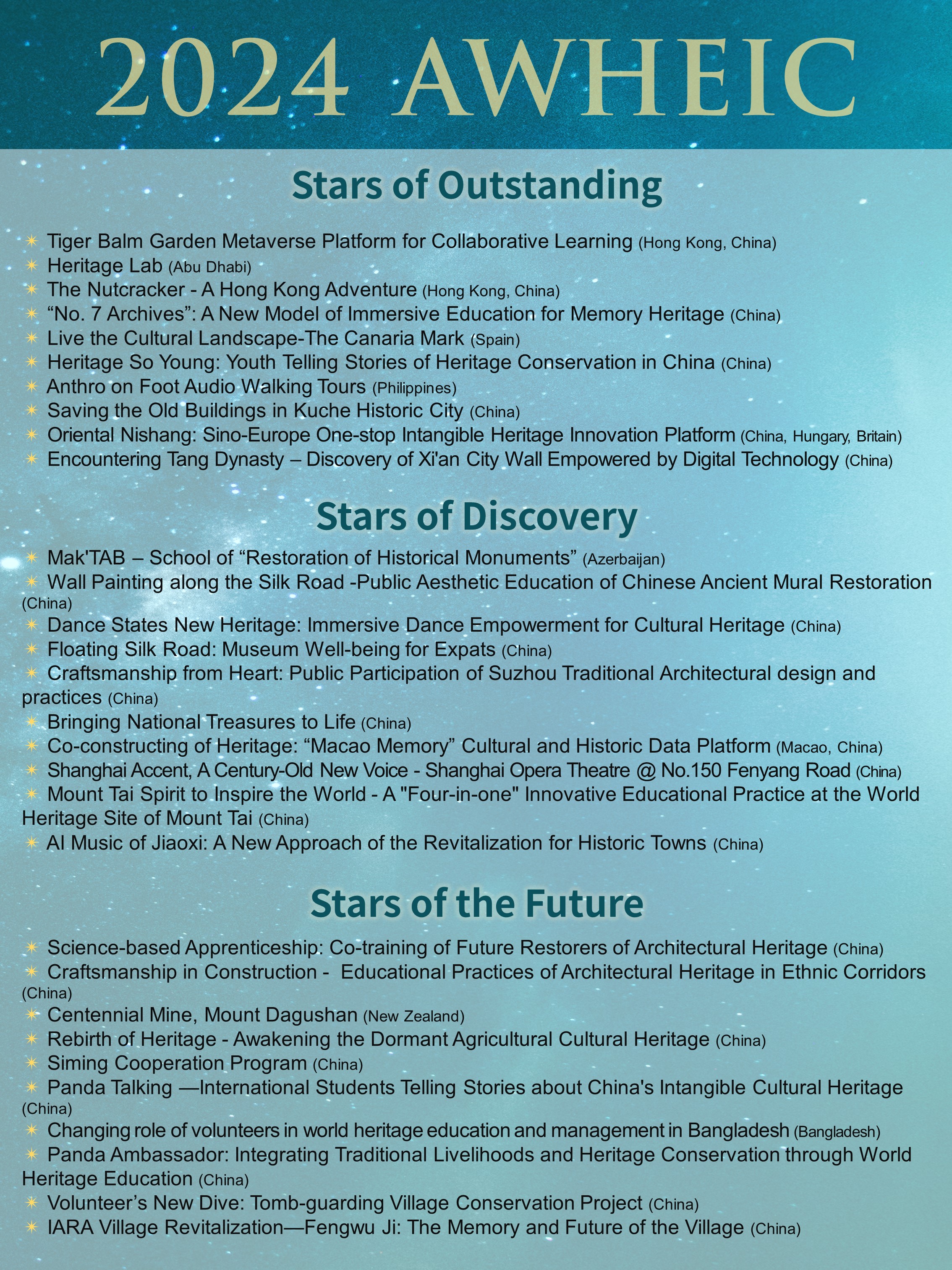 O Prémio Global para Casos Inovadores em Educação sobre o Património Mundial (AWHEIC) é co-organizado pelo Instituto de Formação e Investigação do Património Mundial para a Ásia e a Região do Pacífico (WHITRAP), sob os auspícios da UNESCO e do Centro Internacional para UNESCO ASPnet (ICUA), dirigido pela Comissão Nacional da República Popular da China para a UNESCO. O Prémio visa construir em conjunto, para inovadores da educação patrimonial em todo o mundo, uma plataforma de colaboração e intercâmbio internacional para partilha, focalizando na inovação dos modelos de educação patrimonial. Em 2021, o WHITRAP lançou o concurso global dos projectos inovadores sobre a educação do Património Mundial. Em 2022, o AWHEIC foi criado para comemorar o 50º aniversário da Convenção do Património Mundial.