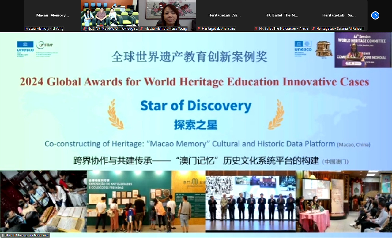 Na altura da organização da 46ª Conferência sobre Património Mundial, o Instituto de Formação e Investigação do Património Mundial para a Ásia e a Região do Pacífico (WHITRAP), sob os auspícios da Organização das Nações Unidas para a Educação, Ciência e Cultura (UNESCO), anunciou a lista dos vencedores do Prémio Global 2024 para Casos Inovadores em Educação sobre o Património Mundial (AWHEIC). O projecto “Memória de Macau” da Fundação Macau (FM) foi classificado com “Estrela de Descobrimento”.