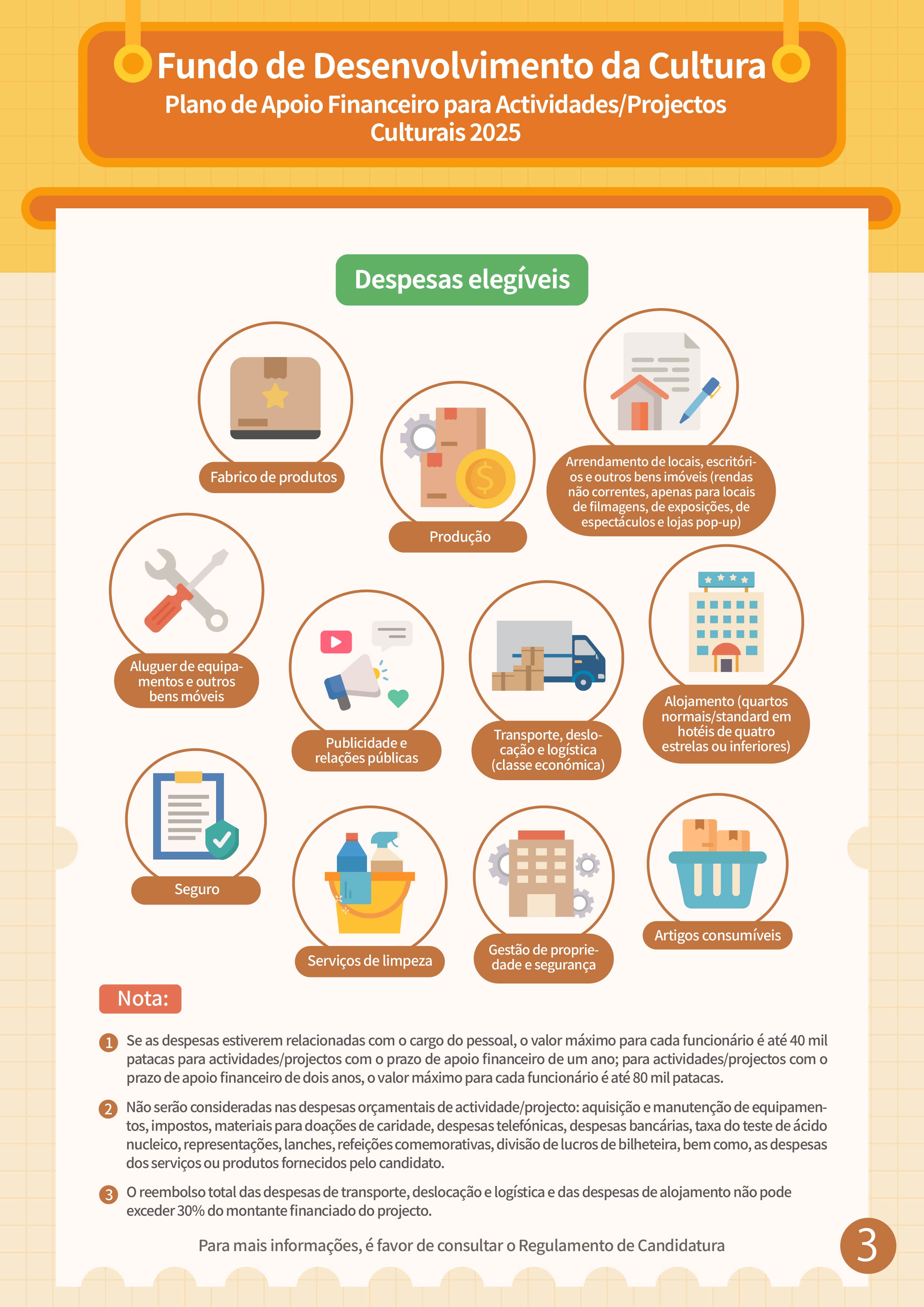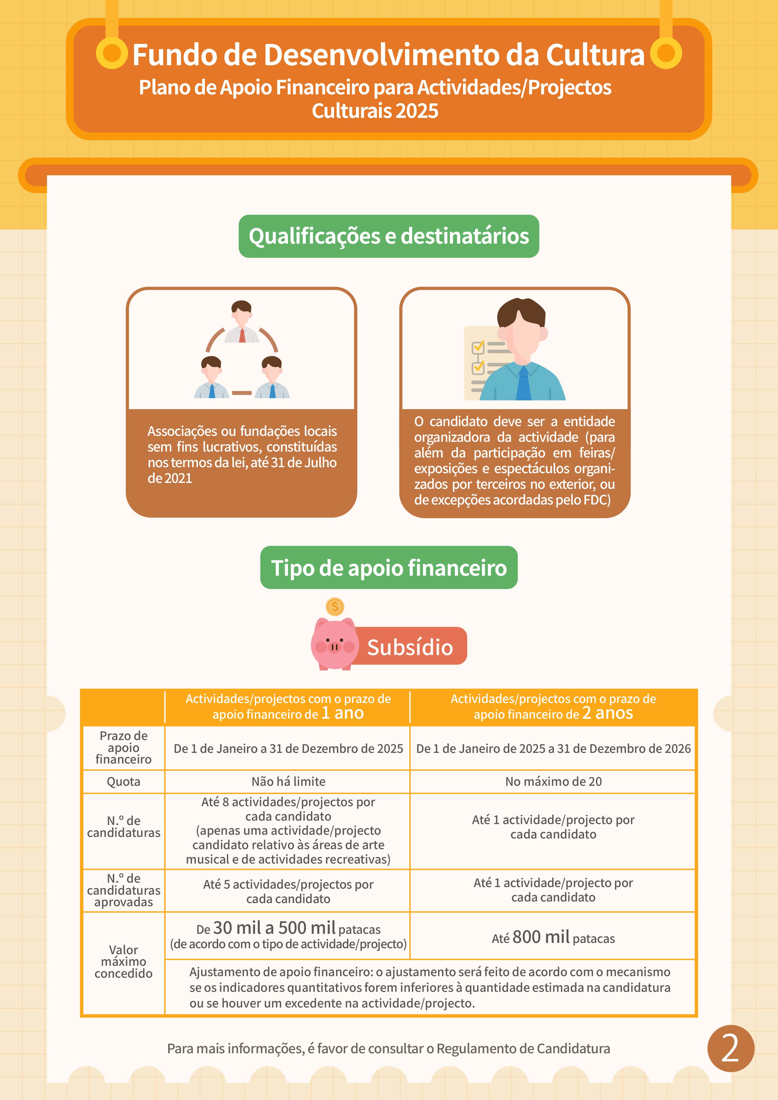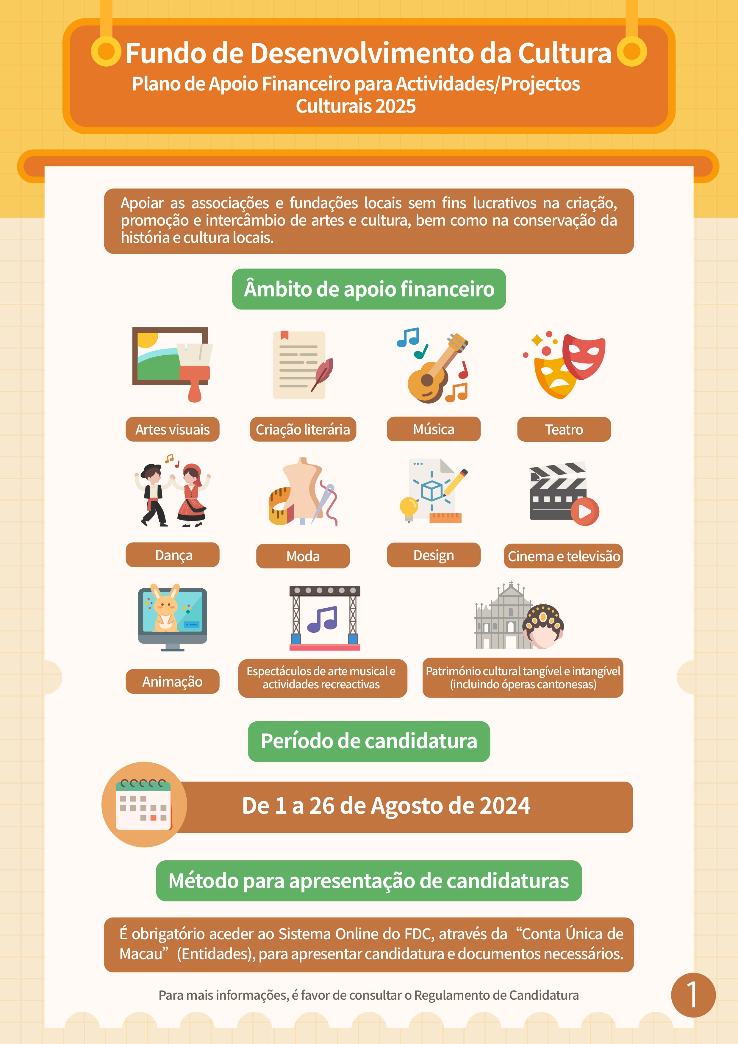 A apresentação de candidaturas ao “Plano de Apoio Financeiro para Actividades/Projectos Culturais 2025” terá lugar de 1 a 26 de Agosto. O âmbito de apoio financeiro inclui as actividades/projectos relacionados com as artes visuais, criação literária, música, arte musical (incluindo diálogo musical, destaques de óperas, apenas sob a forma de actuações) e actividades recreactivas (canções clássicas e populares, apenas sob a forma de actuações), teatro, dança, património cultural tangível, património cultural intangível (incluindo óperas cantonesas), moda, design, cinema e televisão, animação.