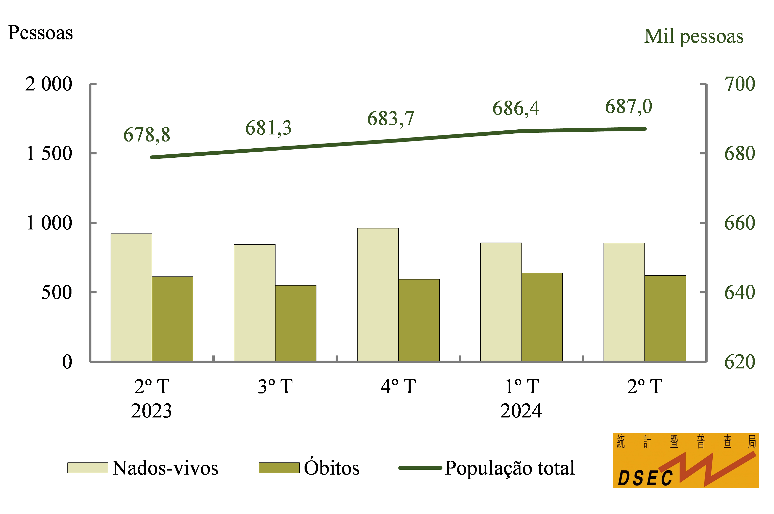 Analisando por trimestre, registaram-se 853 nados-vivos, 621 óbitos e 725 casamentos no segundo trimestre de 2024, menos 3, 19 e 212, respectivmante, em termos trimestrais. Havia 845 indivíduos do Interior da China recém-chegados a Macau titulares de "Salvo-Conduto Singular" e foi concedida nova autorização de residência em Macau a 199 indivíduos, registando-se variações de +119 e de -73, respectivamente, em termos trimestrais. Existiam 181.108 trabalhadores não residentes no fim do segundo trimestre do corrente ano, mais 1.639, face ao fim do trimestre passado.