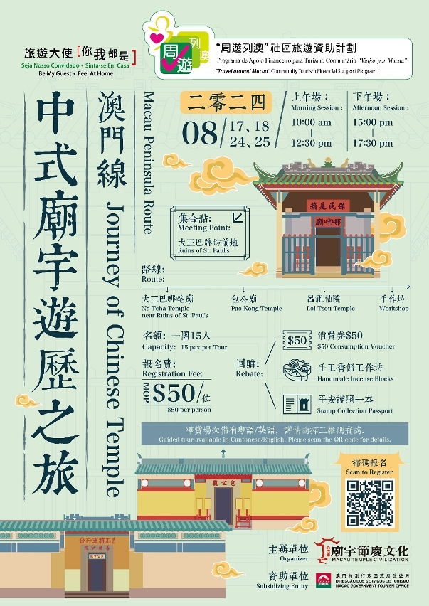 A actividade de visitas guiadas “Journey of Chinese Temples – Macao Peninsula Route” terá lugar nos sábados e domingos de 17 a 25 de Agosto, com uma sessão durante a parte da manhã e outra à tarde, sendo que no dia 25 de Agosto haverá sessões bilingues em chinês e inglês. Os participantes vão acompanhar os guias numa visita guiada a emblemáticos templos de cultura chinesa da península de Macau - o Templo Na Cha, o Templo Pao Kong e o Templo Loi Tsou -, bem como percorrer o Património Mundial e experienciar um workshop de incenso artesanal na Casa do Mandarim.