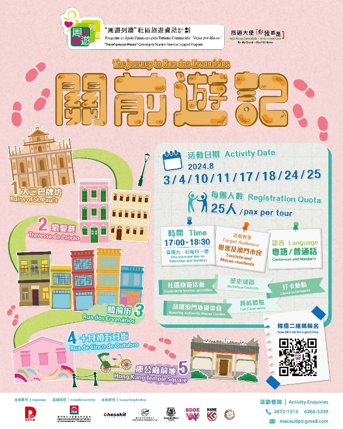 Através do seu programa de apoio financeiro, a DST continua a incentivar as associações locais a realizarem actividades ou projectos turísticos diversificados, com vista a impulsionar a economia comunitária. Em Agosto, associações subsidiadas lançam os passeios “Story Telling in Ancient‧Streets In-depth Tour”, “The journey to Rua dos Ervanários”, “Journey of Chinese Temples – Macao Peninsula Route”, e a oficina “Taste of intangible heritage cuisine, explore world heritage sites” Traditional Food Making Workshop, entre outras actividades comunitárias e gastronómicas, com o objectivo de visitar o Património Mundial e explorar vários bairros de Macau com os residentes e visitantes durante o Verão, experienciando a diversão do “turismo +”.