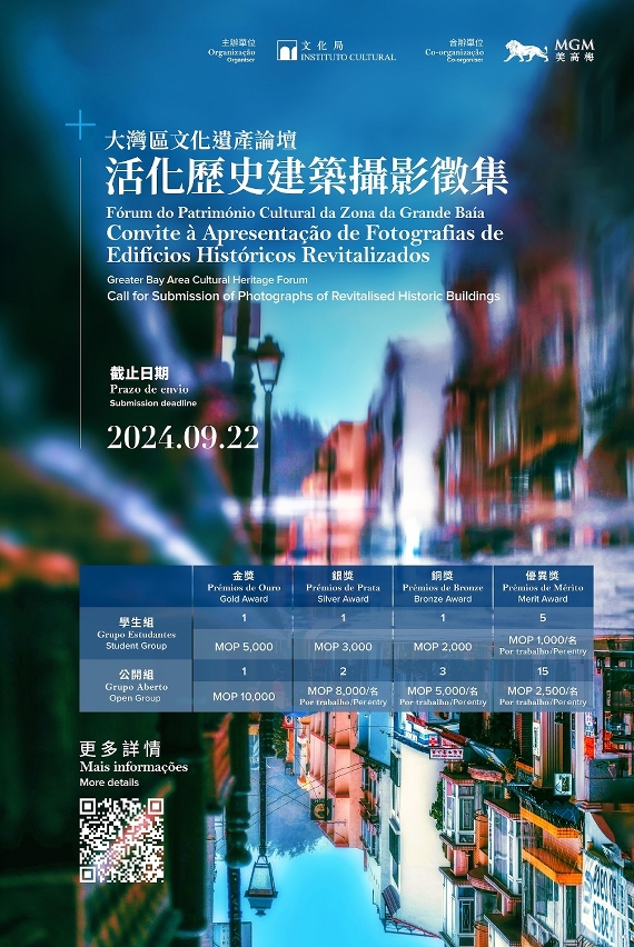 Por ocasião da organização do “Fórum do Património Cultural da Zona da Grande Baía” em Macau, que terá lugar em Outubro do corrente ano, o IC está igualmente a lançar uma série de actividades subjacentes ao Fórum, incluindo o “Fórum do Património Cultural da Zona da Grande Baía – Convite à Apresentação de Fotografias de Edifícios Históricos Revitalizados”, organizado pelo IC e co-organizado pelo MGM. Esta iniciativa em torno do tema de “edifícios históricos revitalizados em Macau” apela à apresentação de trabalhos fotográficos de residentes de Macau de diferentes faixas etárias, procurando apresentar os resultados da revitalização dos edifícios históricos, conforme vistos pelo próprio público. Este Convite para a apresentação de fotografias divide-se nas categorias de “estudante” e “aberta”. Cada categoria contempla prémios que vão desde o Prémio de Ouro, o Prémio de Prata, o Prémio de Bronze e Prémios de Mérito. O montante dos Prémios de Ouro nas categorias de “estudante” e “aberta” é, respectivamente, de MOP5.000 e MOP10.000.