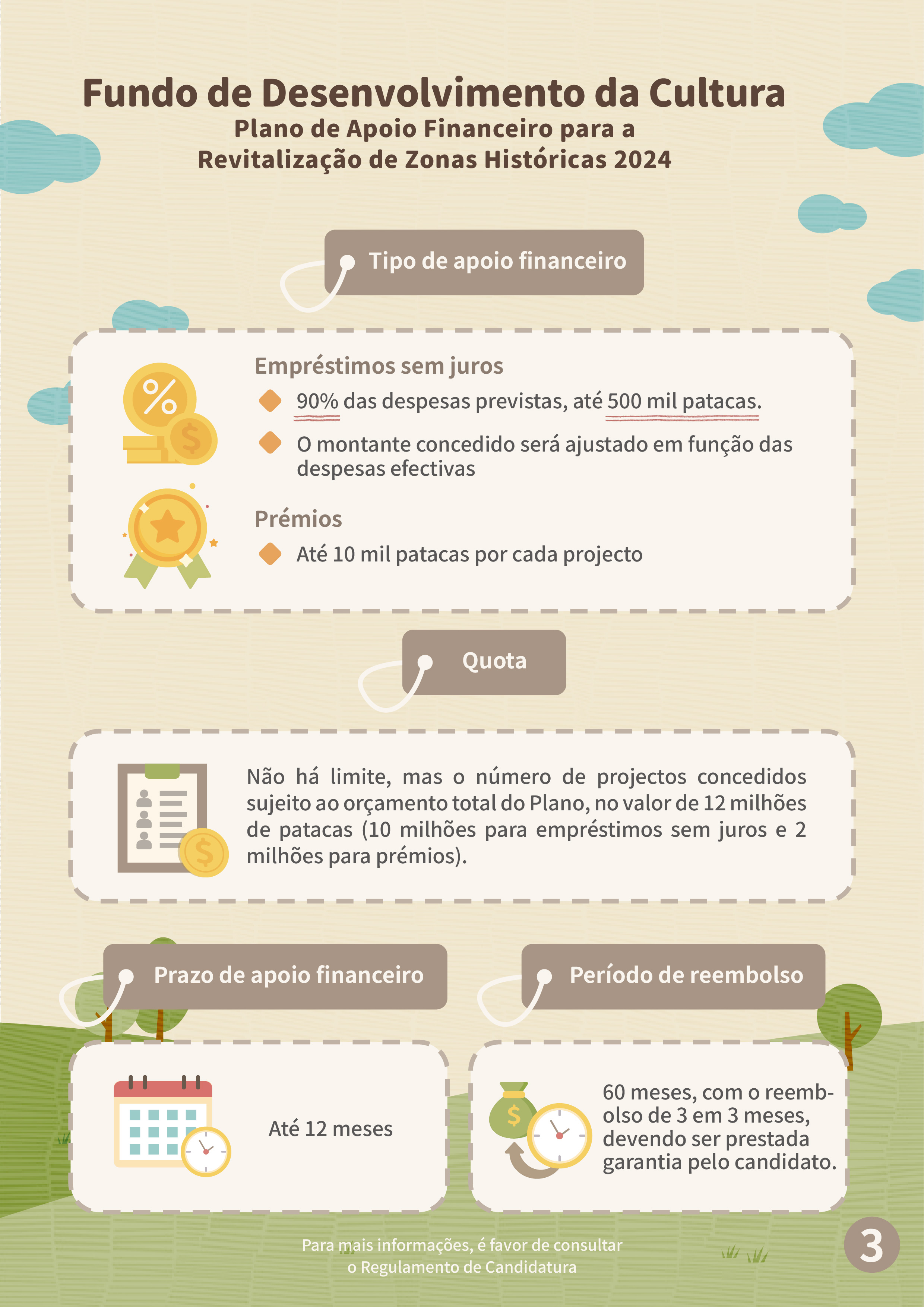 O Fundo de Desenvolvimento da Cultura (adiante designado por “FDC”) aceitará candidaturas ao “Plano de apoio financeiro para a revitalização de zonas históricas 2024” (adiante designado por “Plano”) de 10 de Setembro a 30 de Dezembro, visando incentivar as empresas a explorarem lojas ou espaços em articulação com o posicionamento de cada zona, cultivar projectos comerciais com características distintas e criar uma atmosfera activa nas zonas e impulsionar a vitalidade das zonas históricos, premiando ainda projectos que tenham contribuído para a promoção do desenvolvimento das zonas históricas durante o período de funcionamento.