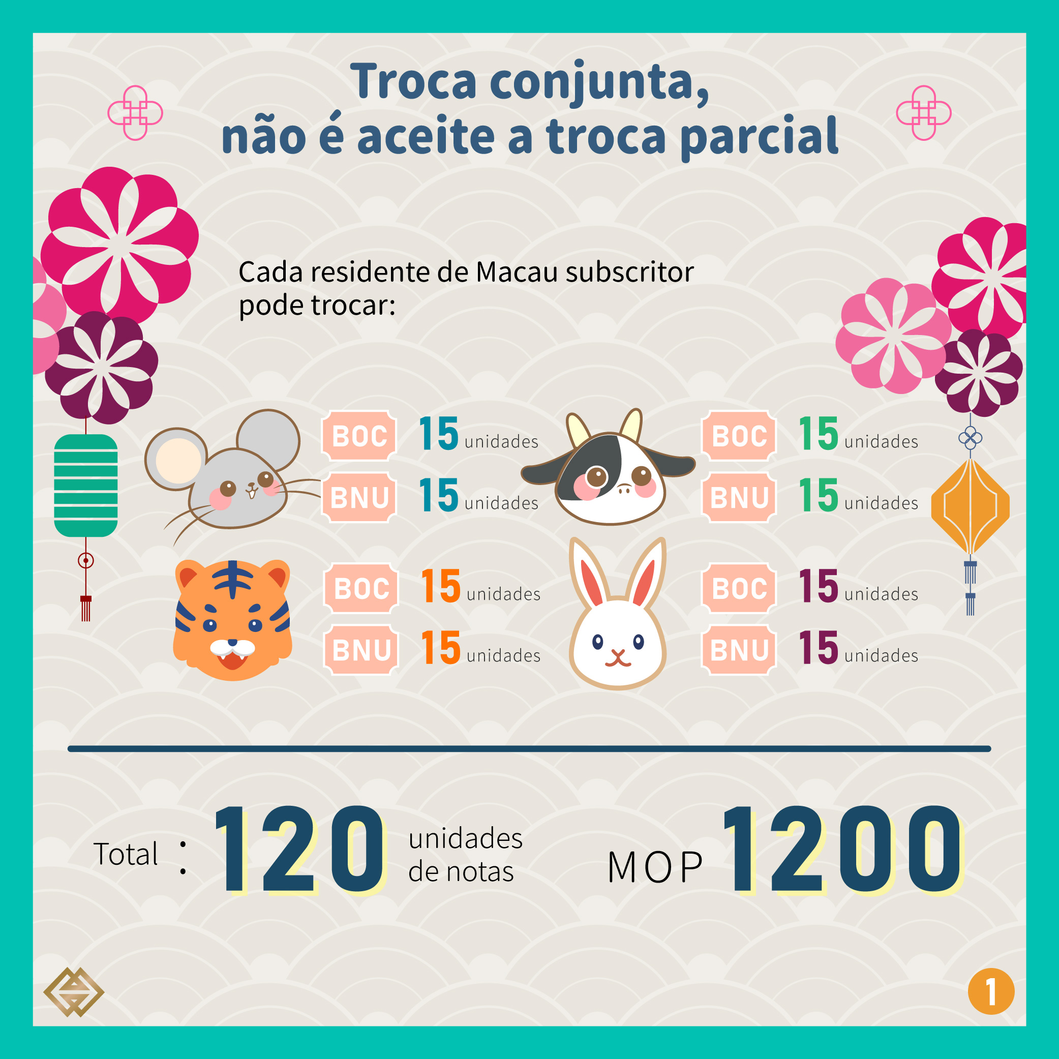 Após confirmação do número de subscritores efectivos, o número de cada tipo de notas zodiacais dos Anos Lunares do Rato, do Búfalo, do Tigre e do Coelho que cada banco emissor disponibilizará para troca, por cada residente de Macau subscritor, é de 15 (quinze) unidades, pelo que as referidas notas disponíveis para troca totalizam 120 (cento e vinte) unidades, cujo alor envolvido ascende a mil e duzentas patacas. As notas zodiacais dos dois bancos emissores devem ser trocadas em simultâneo, não podendo ser trocadas parcialmente.