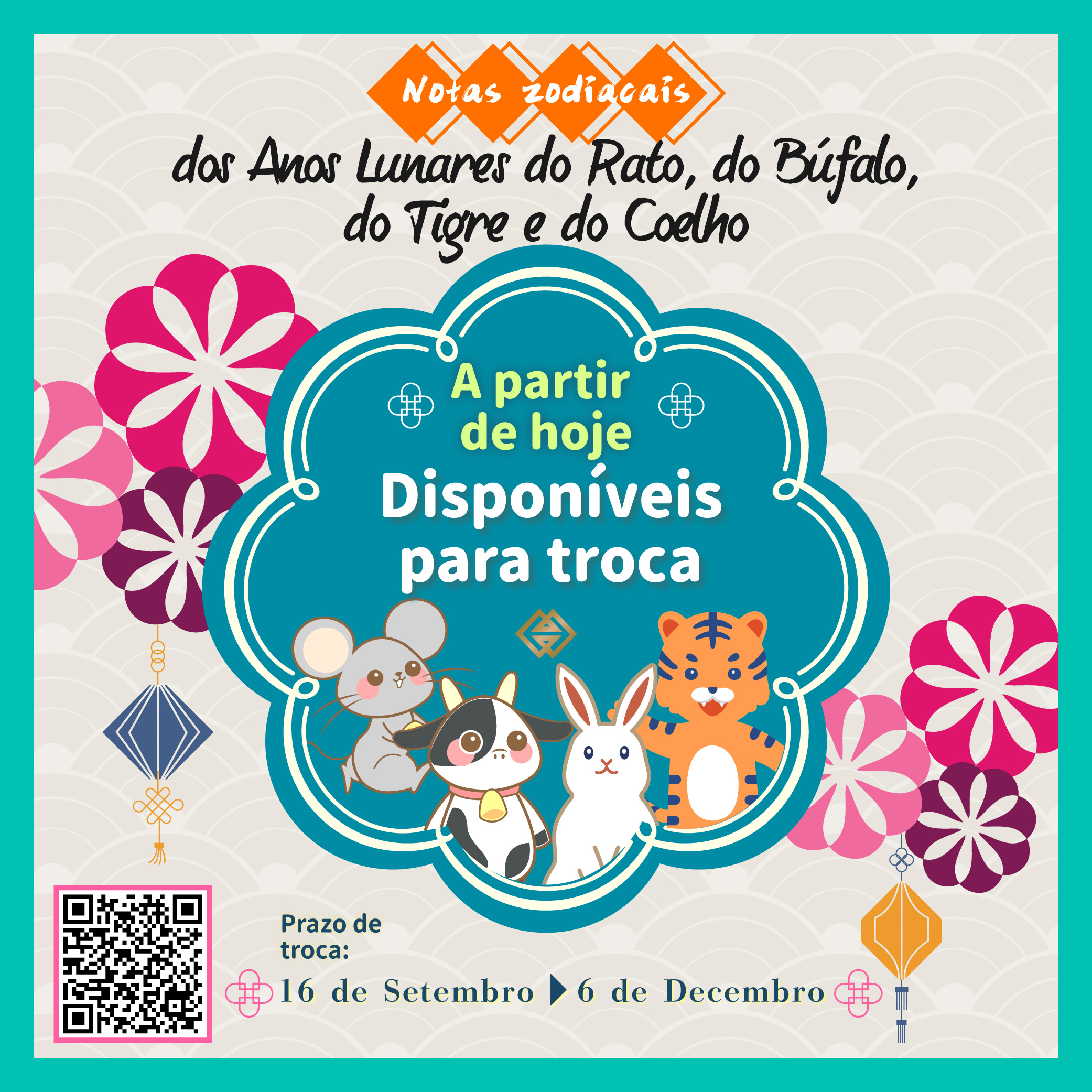 As notas zodiacais dos Anos Lunares do Rato, do Búfalo, do Tigre e do Coelho emitidas pelos dois bancos emissores estarão disponíveis para troca a partir de hoje (dia 16) até ao dia 6 de Dezembro de 2024. Os residentes de Macau que efectuaram a subscrição para efeitos de troca devem fazer-se acompanhar do original do seu bilhete de identidade de residente e comparecer, na data previamente agendada, na agência indicada para a troca das notas, sendo que o número de cada tipo de notas zodiacais dos Anos Lunares do Rato, do Búfalo, do Tigre e do Coelho que cada banco emissor disponibilizará para troca, por cada residente de Macau subscritor, é de 15 (quinze) unidades, pelo que as referidas notas disponíveis para troca totalizam 120 (cento e vinte) unidades, cujo valor envolvido ascende a mil e duzentas patacas.
