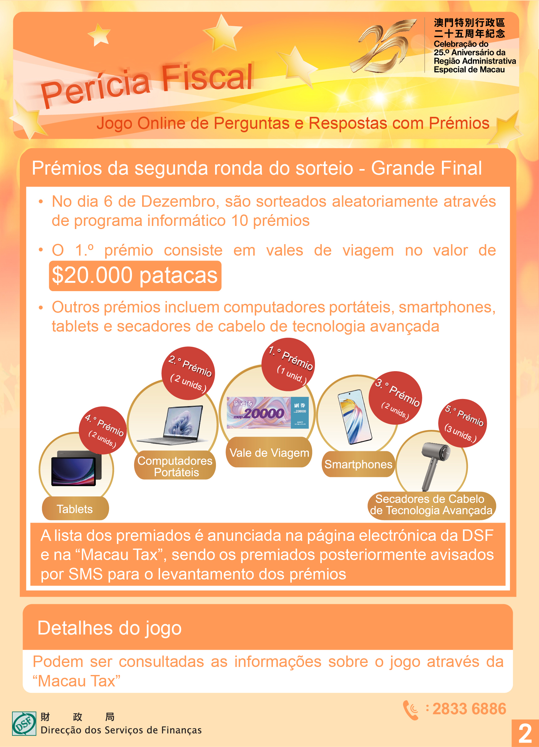 Para celebrar o 25.º Aniversário do Retorno de Macau à Pátria, a Direcção dos Serviços de Finanças lança, no período de 26 de Setembro a 30 de Novembro, o jogo “Perícia Fiscal” Jogo Online de Perguntas e Respostas com Prémios, esperando que os cidadãos através do mesmo possam aprofundar os conhecimentos no âmbito da legislação fiscal, bem como incentivá-los a tratar das formalidades fiscais através da aplicação móvel “Macau Tax” destes Serviços, e assim, festejar juntamente com o público o aniversário do retorno de Macau à Pátria.