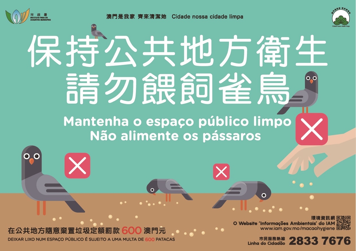Além disso, os fiscais encontraram, na Praça Flor de Lótus, uma grande quantidade de pedaços de pão, que terá sido usada para alimentar as aves selvagens. Com o intuito de manter a limpeza e salubridade dos espaços públicos, este Instituto irá continuar a reforçar a execução da lei, apelando aos residentes e turistas para que não alimentem as aves selvagens. Os infractores poderão ser punidos com multa de 600 patacas.
