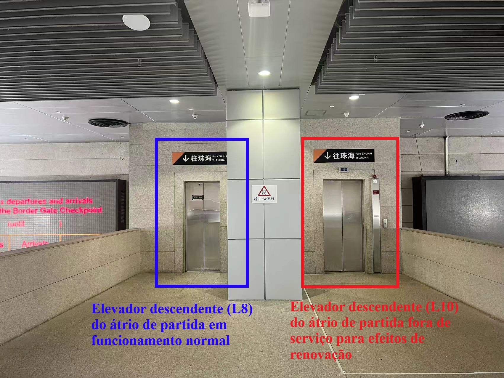 Os passageiros que saiam de Macau podem usar o elevador descendente L8, quando necessário