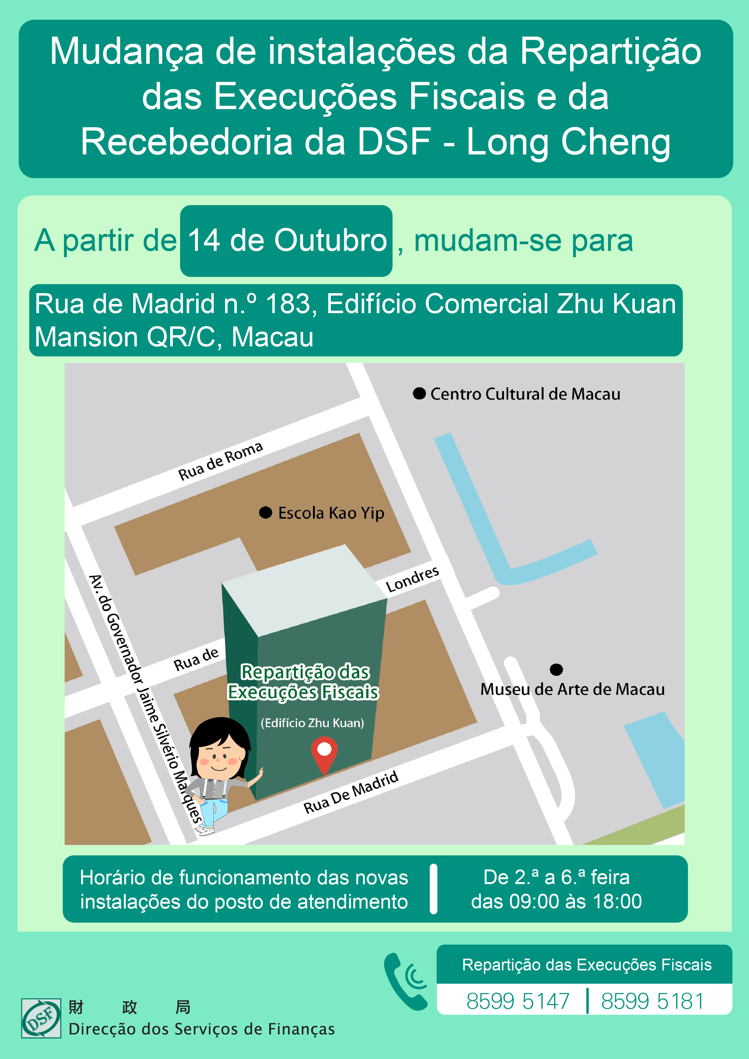 Informa-se que a partir do dia 11 de Outubro estão encerradas a “Repartição das Execuções Fiscais” e a “Recebedoria da DSF - Long Cheng” da Direcção dos Serviços de Finanças, localizadas no rés-do-chão do Edifício Long Cheng sito na Avenida do Dr. Rodrigo Rodrigues n.os 614A a 640, em Macau, passando a funcionar a partir do dia 14 de Outubro, no Edifício Comercial Zhu Kuan Mansion, sito na Rua de Madrid n.º 183, QR/C, Macau.