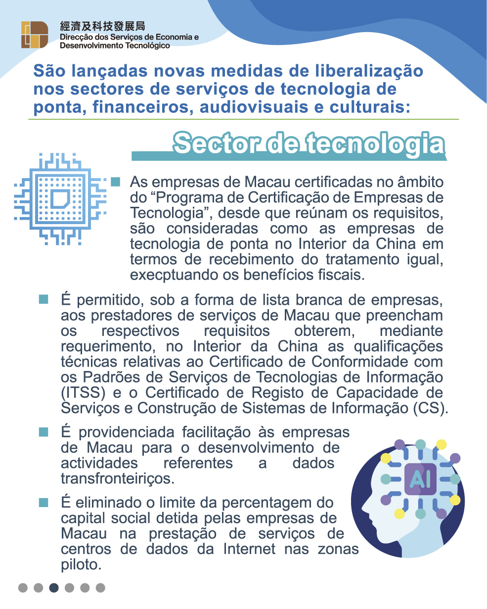 No Acordo relativo à Alteração II, são acrescentadas medidas de liberalização nos sectores de serviços de tecnologia de ponta, financeiros, audiovisuais e culturais, com vista a apoiar a estratégia de desenvolvimento da diversificação adequada da economia de Macau “1 + 4”, criando um novo espaço para o desenvolvimento da diversificação adequada da economia de Macau. No sector de tecnologia, as empresas de Macau certificadas no âmbito do “Programa de Certificação de Empresas de Tecnologia”, desde que reúnam os requisitos, são consideradas como as empresas de tecnologia de ponta no Interior da China em termos de recebimento do tratamento igual, execptuando os benefícios fiscais; é permitido aos prestadores de serviços de Macau que preencham os respectivos requisitos obterem no Interior da China as respectivas qualificações técnicas; é eliminado o limite da percentagem do capital social detida pelas empresas de Macau na prestação de serviços de centros de dados da Internet nas zonas piloto. No sector dos serviços financeiros, é eliminado o requisito do exercício, pelo menos 5 anos, de actividade comercial substancial para os bancos de Macau e é eliminada a restrição relativa ao activo total no fim do ano das instituições financeiras estrangeiras para a sua participação social em seguradoras, entre outros. Nos sectores audiovisuais e culturais, é permitido às empresas de Macau investirem na produção cinematográfica e as telenovelas co-produzidas com a parte do Interior da China podem ser consideradas como domesticamente produzidas para efeitos da sua emissão e distribuição, entre outros.