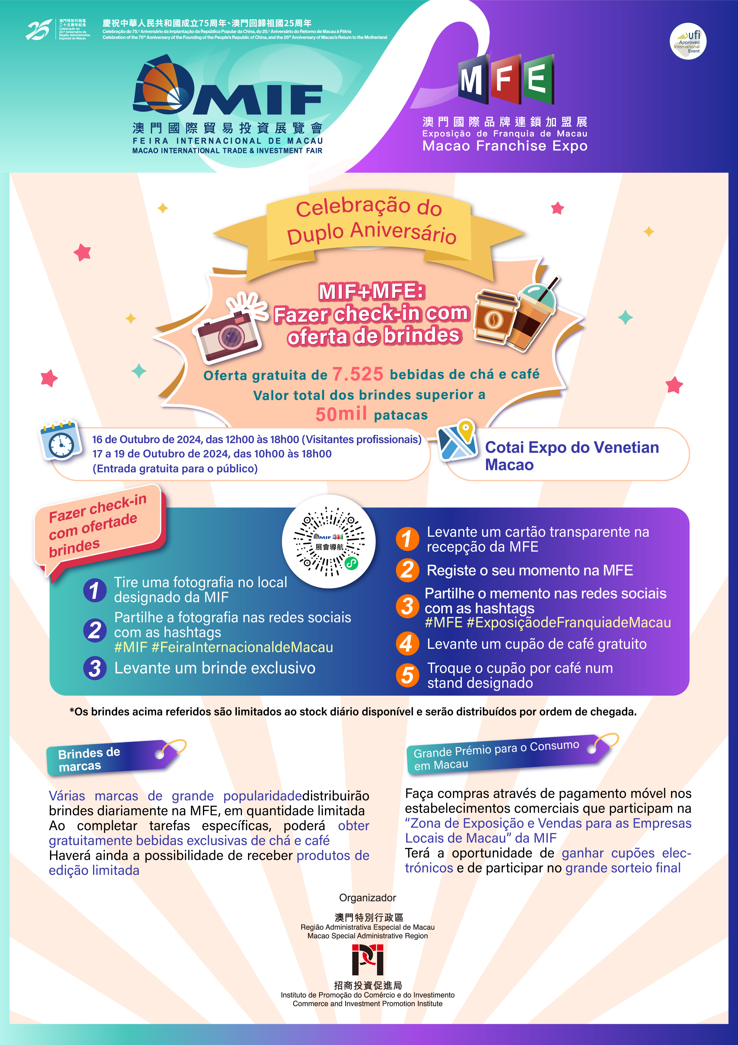 Em celebração do duplo aniversário, a entidade organizadora preparará 7.525 copos de café e chá, bem como outros brindes no valor total de mais de 500.000 patacas. Para receber os brindes de graça, basta aos visitantes tirar fotografias em pontos designados no local da MIF&MFE. Além disso, em resposta à actividade de promoção de consumo em grande escala, intitulada “Grande prémio para o consumo em Macau”, os visitantes que fazem compras no local, através de pagamento móvel nos estabelecimentos comerciais na Zona de Exposição e Vendas para as Empresas Locais de Macau da 29.ª MIF, terão a oportunidade de ganhar cupões electrónicos e de participar no grande sorteio final.