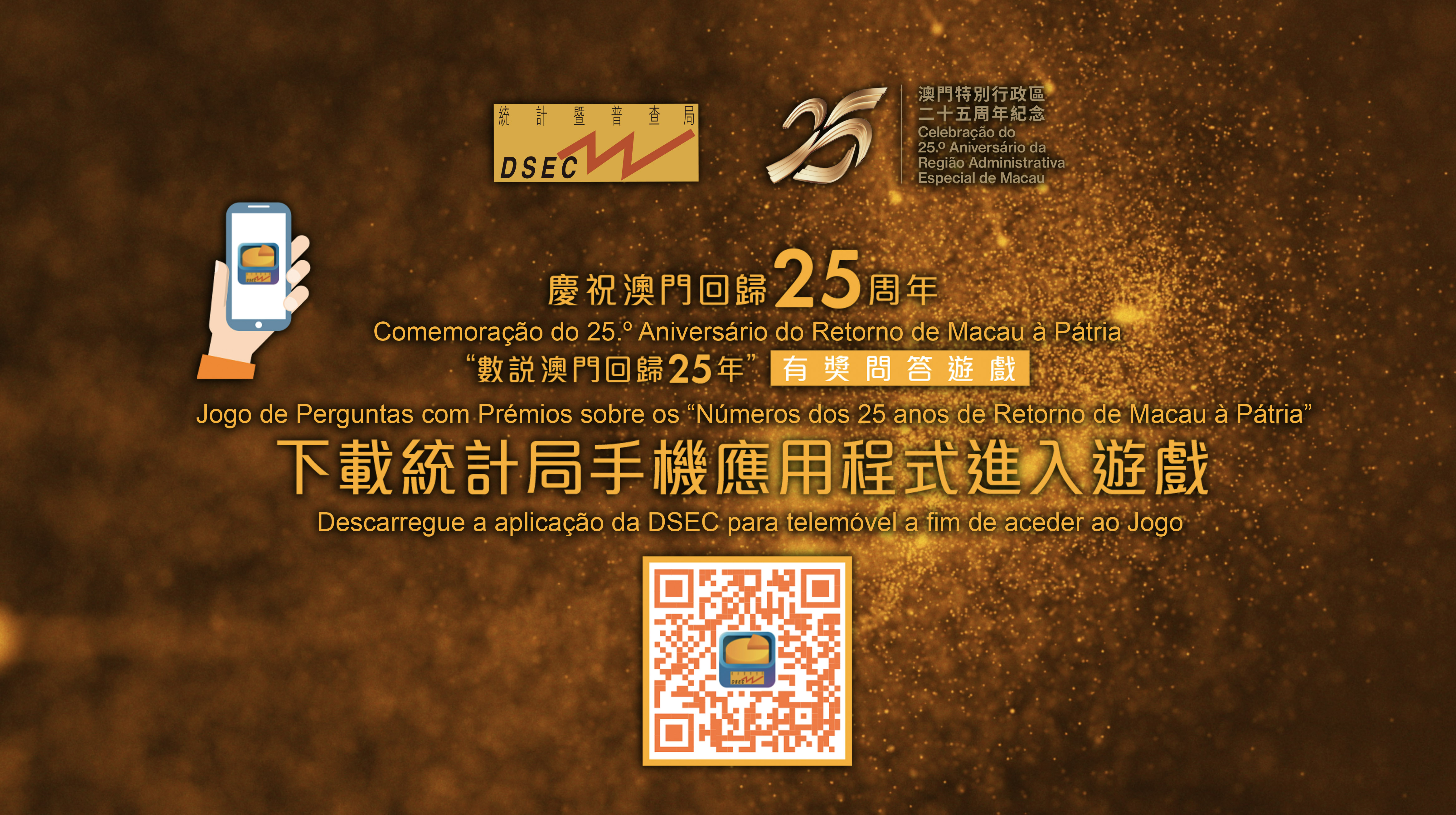A Direcção dos Serviços de Estatística e Censos (DSEC) organiza o Jogo de Perguntas com Prémios sobre os “Números dos 25 anos de Retorno de Macau à Pátria”, com o intuito de celebrar o 25.º aniversário do estabelecimento da Região Administrativa Especial de Macau (RAEM) e festejar esta comemoração junto dos cidadãos. Espera-se que o público conheça o desenvolvimento e as evoluções socioeconómicos de Macau desde que retornou à Pátria, através dos dados estatísticos constantes no Jogo.