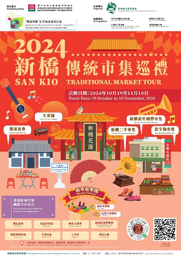 A “2024 San Kio Traditional Market Tour” tem lugar entre 19 de Outubro e 10 de Novembro, no Largo do Pagode do Patane, Jardim San Kio, Rua da Emenda e Rua da Erva. As actividades incluem tendas de jogos, visitas guiadas aos bairros comunitários, sorteios de fim-de-semana, descontos de consumo no Bairro de San Kio, espectáculos intermitentes nos bairros comunitários, feiras temáticas, oficinas, pinturas, bazares, entre outros. O “Bazaar Carnivals”, que se realiza pela primeira vez, inclui dois jogos-desafio: “50 patacas para encher a barriga” e “100 patacas para ajudar a mãe a comprar comida”, numa série de actividades para que os residentes e visitantes possam experienciar, de forma imersiva, os bairros tradicionais de Macau, caracterizados pelo estilo antigo, mostrando a diversidade da cultura gastronómica de Macau.
