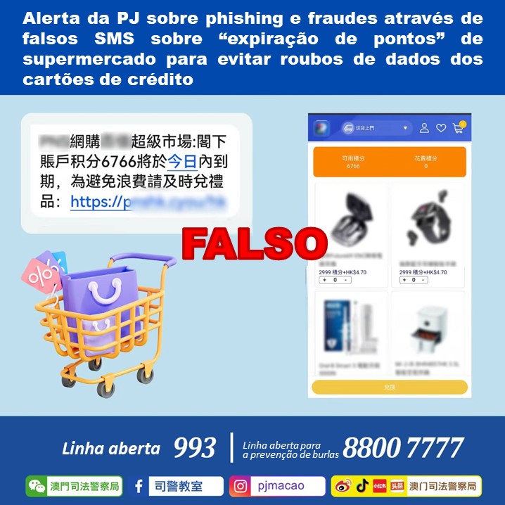 No dia 20 de Outubro, a Polícia Judiciária descobriu que existem indivíduos que se fazem passar por um grande supermercado de Hong Kong e Macau, enviando mensagens falsas a pessoas escolhidas aleatoriamente, os SMS alegam que “os pontos do cliente estão prestes a expirar” e dizem às pessoas de clicar num link indicado nesta mensagem. Ao fazê-lo, entra-se num website contrafeito daquele supermercado, onde à pessoa é solicitado que introduza os dados do cartão de crédito para trocar os pontos por objectos a um baixo custo. Assim, os burlões roubam informações dos cartões de crédito para realizar transacções de elevado valor não autorizadas.