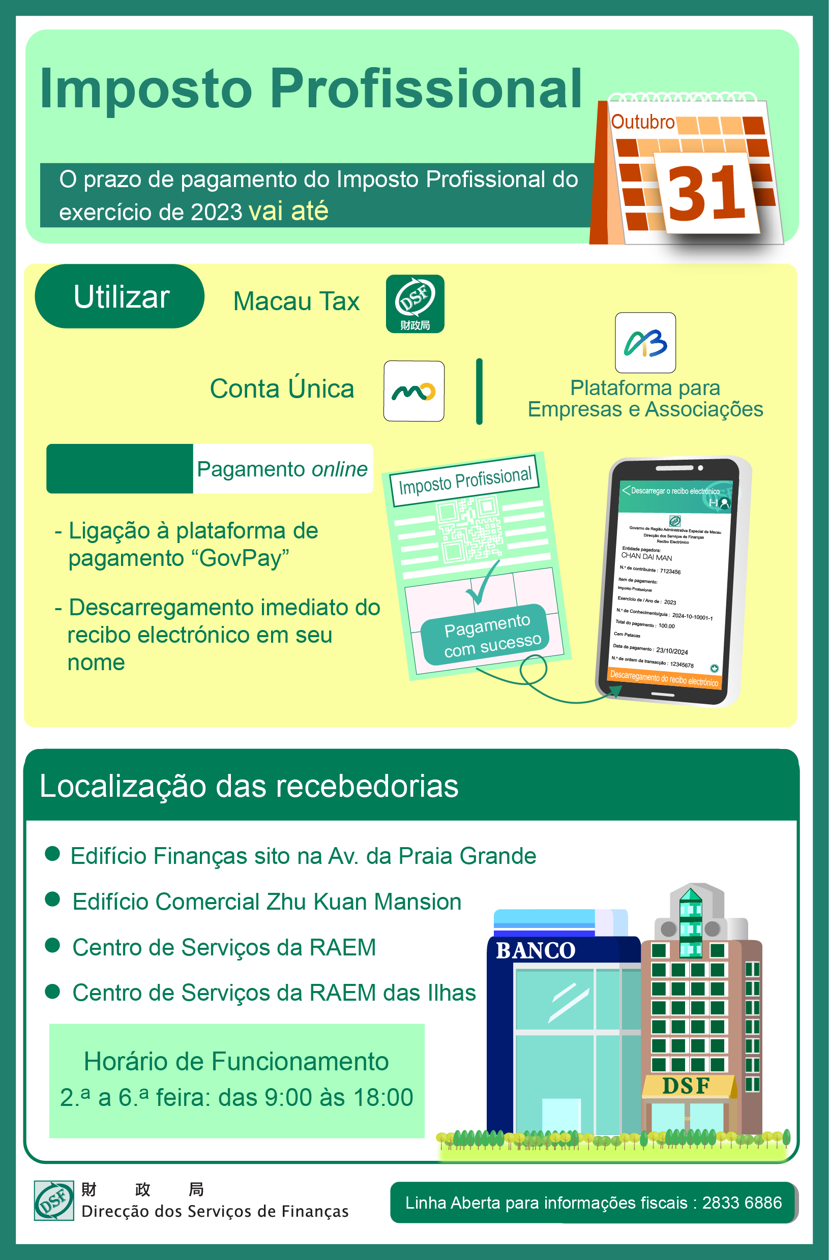 Os contribuintes podem também efectuar o pagamento do imposto nos balcões dos bancos designados, dentro do horário de funcionamento, bem como, através das transacções electrónicas disponibilizadas pelos mesmos; ou ainda, proceder ao seu pagamento nas recebedorias do Edifício “Finanças” sito na Av. da Praia Grande, do Edifício Comercial Zhu Kuan Mansion, do Centro de Serviços da RAEM e do Centro de Serviços da RAEM das Ilhas.