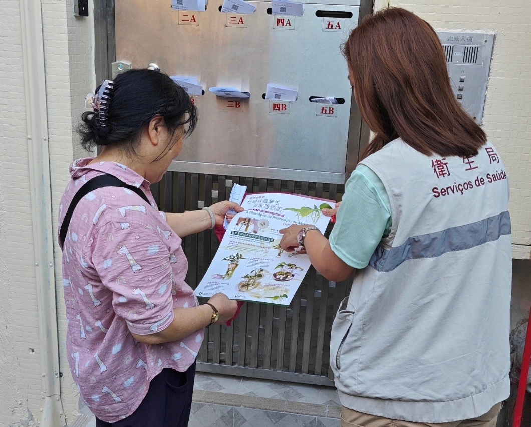 Os Serviços de Saúde, após terem sido notificados, no dia 31 de Outubro, pelo Interior da China, de que o caso confirmado estava relacionado com a trajectória das actividades em Macau, enviaram de imediato pessoal às zonas de risco situadas na Rua de Coelho do Amaral, realizando pesquisa domiciliária de casos de febre de dengue, verificação da fonte de proliferação de mosquitos, educação para a saúde e eliminação química de mosquitos.