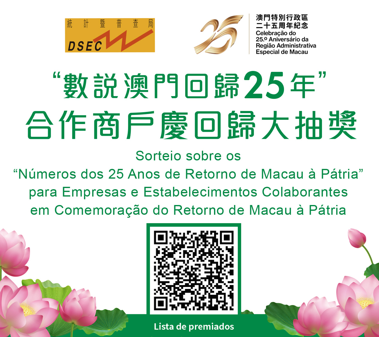 Para celebrar o 25.º aniversário do estabelecimento da Região Administrativa Especial de Macau (RAEM), a Direcção dos Serviços de Estatística e Censos (DSEC) realizou o “Sorteio para Empresas e Estabelecimentos Colaborantes em Comemoração do Retorno de Macau à Pátria”, a fim de agradecer às empresas e estabelecimentos o apoio dado aos trabalhos estatísticos oficiais ao longo dos anos. Todas as empresas e estabelecimentos que colaboraram no preenchimento do questionário da DSEC no período compreendido entre 1 de Janeiro e 30 de Setembro de 2024 ficaram automaticamente habilitados a participar no sorteio. O prémio é composto por uma carta de agradecimento, emitida pela DSEC e um cartão “Macau Pass” comemorativo dos “Números dos 25 Anos de Retorno de Macau à Pátria”, de edição limitada. Incluem-se: 25 exemplares com o valor facial de 1.000 patacas; 50 exemplares com o valor facial de 500 patacas; 75 exemplares com o valor facial de 300 patacas e 100 exemplares com o valor facial de 100 patacas.