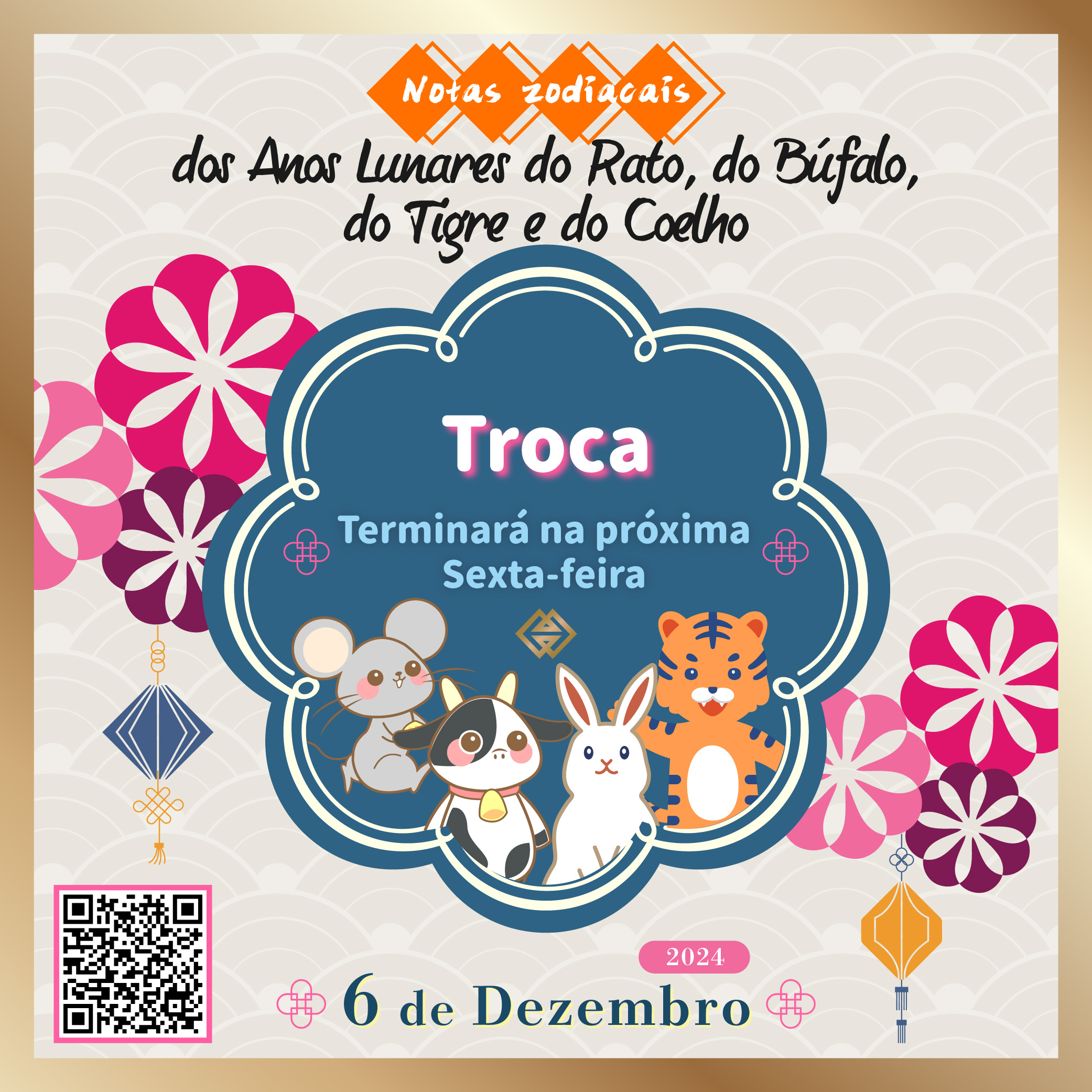 Segundo os procedimentos anteriormente estabelecidos, o termo do prazo para troca das notas zodiacais dos Anos do Rato, do Búfalo, do Tigre e do Coelho decorrerá até 6 de Dezembro de 2024 (Sexta-feira), a AMCM informa que os residentes que procederam à subscrição “on-line” e que não efectuarem a troca das mesmas devam proceder, até ao termo do prazo, à troca das notas, nos locais de troca previamente escolhidos.