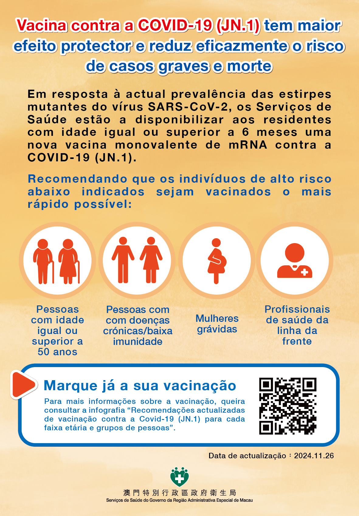 Presentemente, a estirpe mutante de JN.1 é principalmente o novo tipo de vírus SARS-CoV-2 em Macau. Com o intuito de proteger melhor a saúde dos residentes, os Serviços de Saúde, de acordo com as recomendações da Organização Mundial de Saúde, adquiriram a vacina monovalente de mRNA (BioNTech), dedicada especificamente à subvariante JN.1 da Ómicron do vírus SARS-CoV-2 (adiante designada por vacina JN.1), de modo a que os residentes possam ser inoculados.