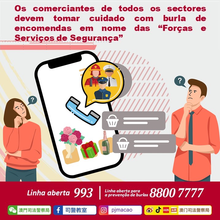 Recentemente, a Polícia Judiciária recebeu informações de várias empresas de Macau, de diversos sectores, relatando haver indivíduos nas redes sociais fazendo-se passar por pessoal das Forças e Serviços de Segurança de Macau. Essas pessoas enviam mensagens nas redes sociais solicitando cotações e, mais tarde, pedem aos comerciantes que encomendem produtos específicos a determinados fornecedores (tais como coroas de flores, vinho tinto ou colchões). Antes de procederem à encomenda, o burlão envia uma captura de tela falsa de remessa bancária, alegando ter já efectuado o pagamento integral da mercadoria, enganando assim o comerciante para que pague um avanço ao falso fornecedor. No entanto, os comerciantes envolvidos reconheceram a tempo estarem perante uma situação de burla e evitaram ser enganados.