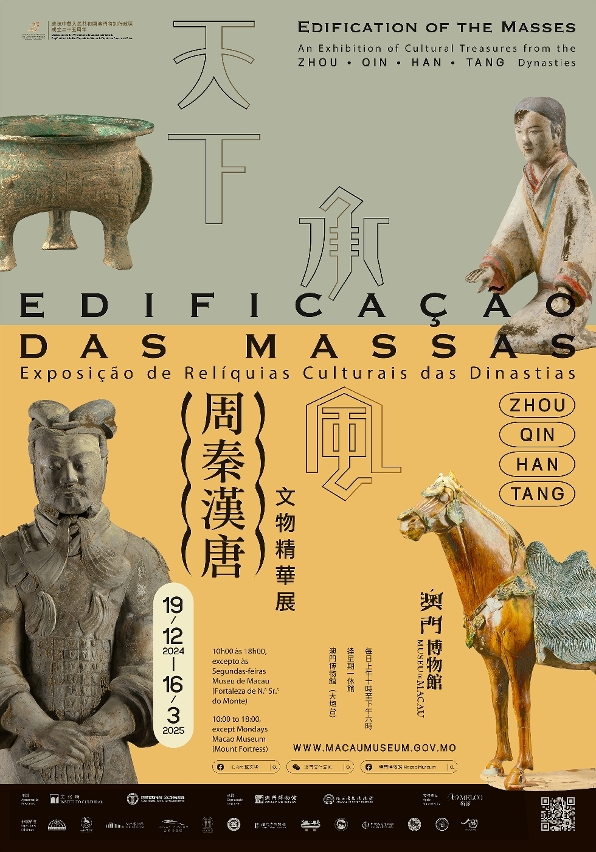 A fim de celebrar o 25.º aniversário do estabelecimento da RAEM e de promover o intercâmbio histórico e cultural entre a Província de Shaanxi e Macau, a “Edificação das Massas: Exposição de Relíquias Culturais das Dinastias Zhou, Qin, Han e Tang”, organizada pelo Instituto Cultural do Governo da RAEM e pelo Instituto Provincial de Relíquias Culturais de Shaanxi, co-organizada pelo Museu de Macau e pelo Museu de História de Shaanxi, contando com o apoio da Melco Resorts & Entertainment, estará patente no Museu de Macau de 19 de Dezembro a 16 de Março de 2025, exibindo uma selecção de peças provenientes de 13 museus do Interior da China. A cerimónia de inauguração terá lugar no dia 27 de Dezembro (Sexta-feira), pelas 18:30 horas, no átrio do Museu de Macau, sendo a mesma aberta ao público em geral.